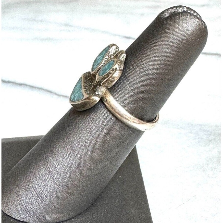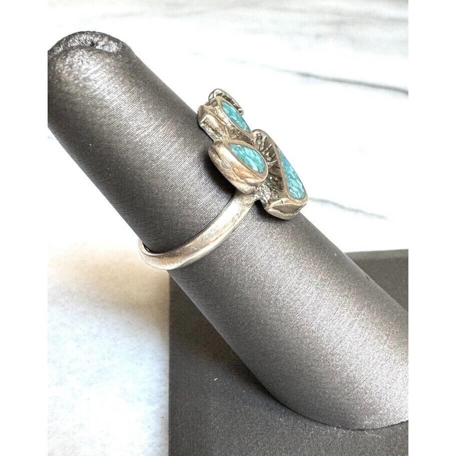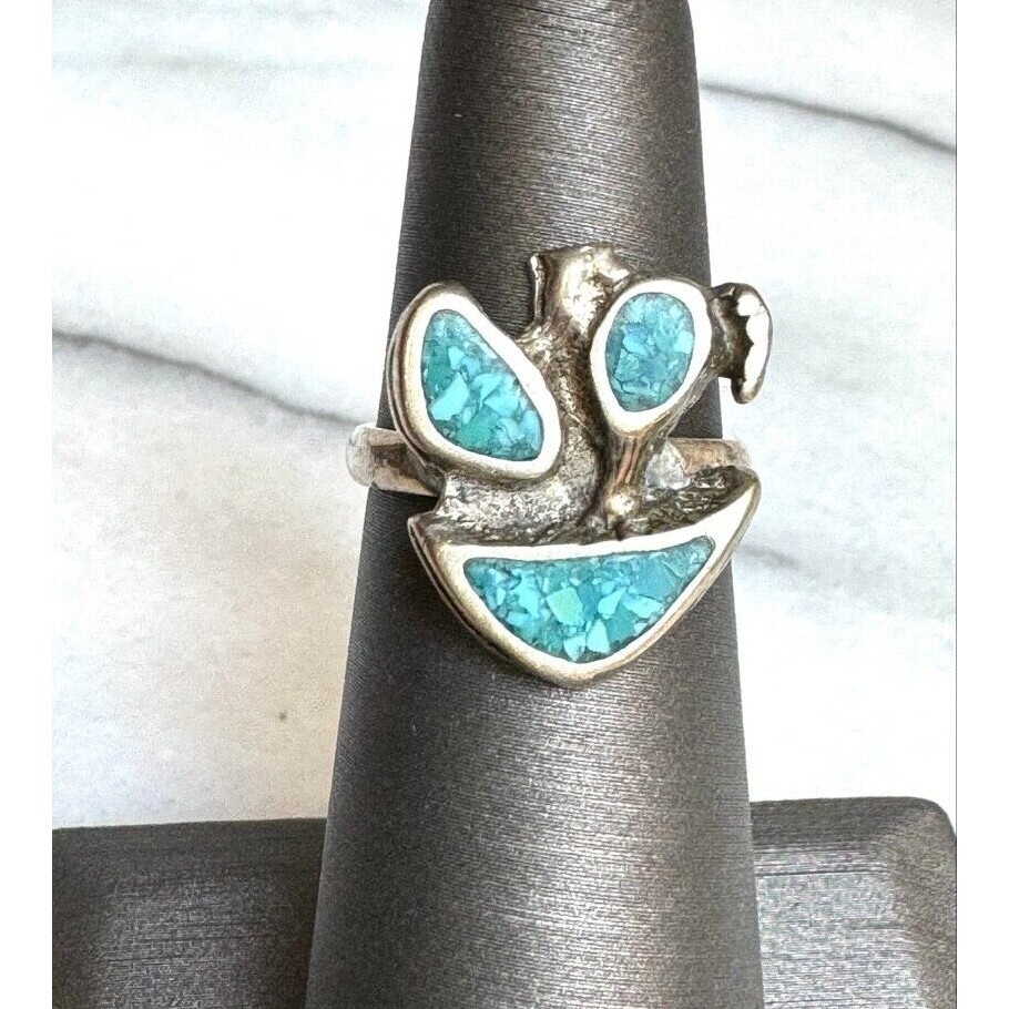 MODERNIST 925 STERLING SILVER TURQUOISE INLAYED ABSTRACT DESIGN RING SIZE 4.75 SKY