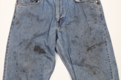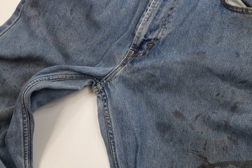 Thrashed. Stains front and back. Distressed and faded. Loose stitching back pocket
