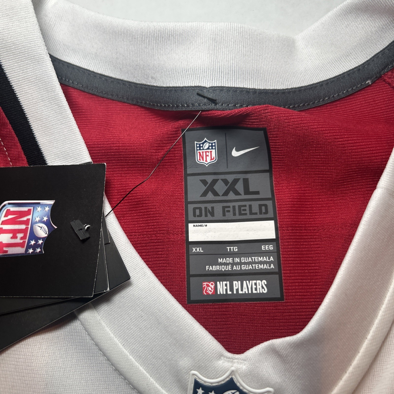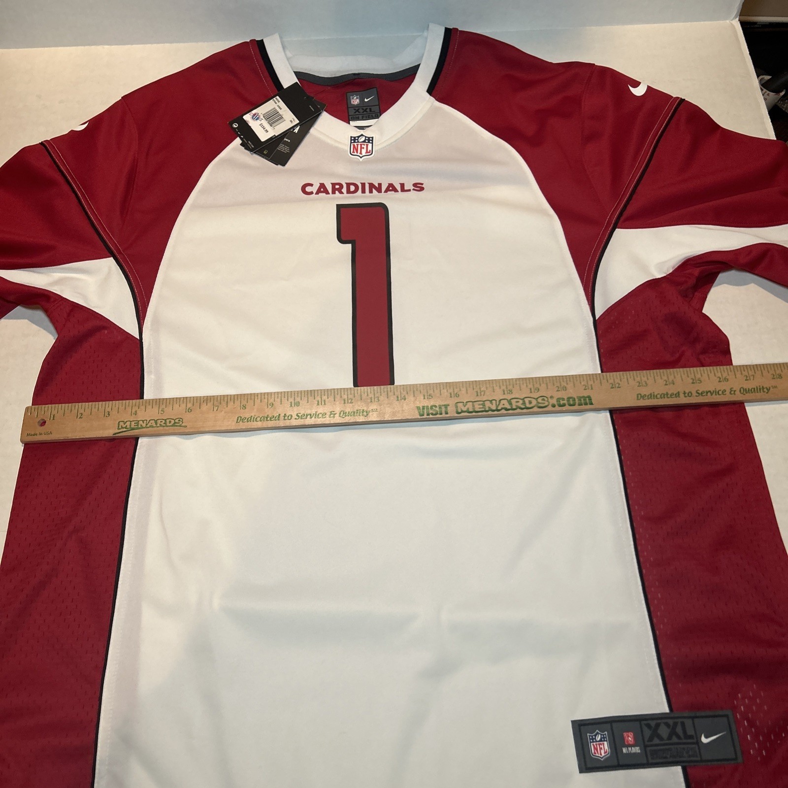 The product is a Nike officially licensed Arizona Cardinals #1 Kyler Murray NFL football jersey in size 2XL. This white jersey is designed for men and is perfect for any fan of the National Football League (NFL). Show your support for the Arizona Cardinals and your favorite player with this high-quality on-field jersey.