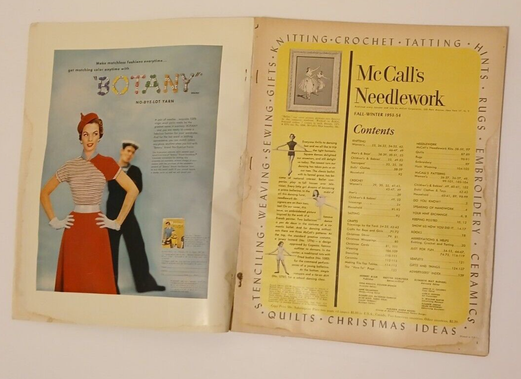 This listin is for an original copy of McCalls Needlework Magazine. This is the Fall/Winter 1953-1954 issue. The cover has minor shelf wear. The pages are clean. There are no missing or torn pages. Pages may have water stains, and or some yellowing due to age. Some edges may be frayed. There is some tearing along the spine.