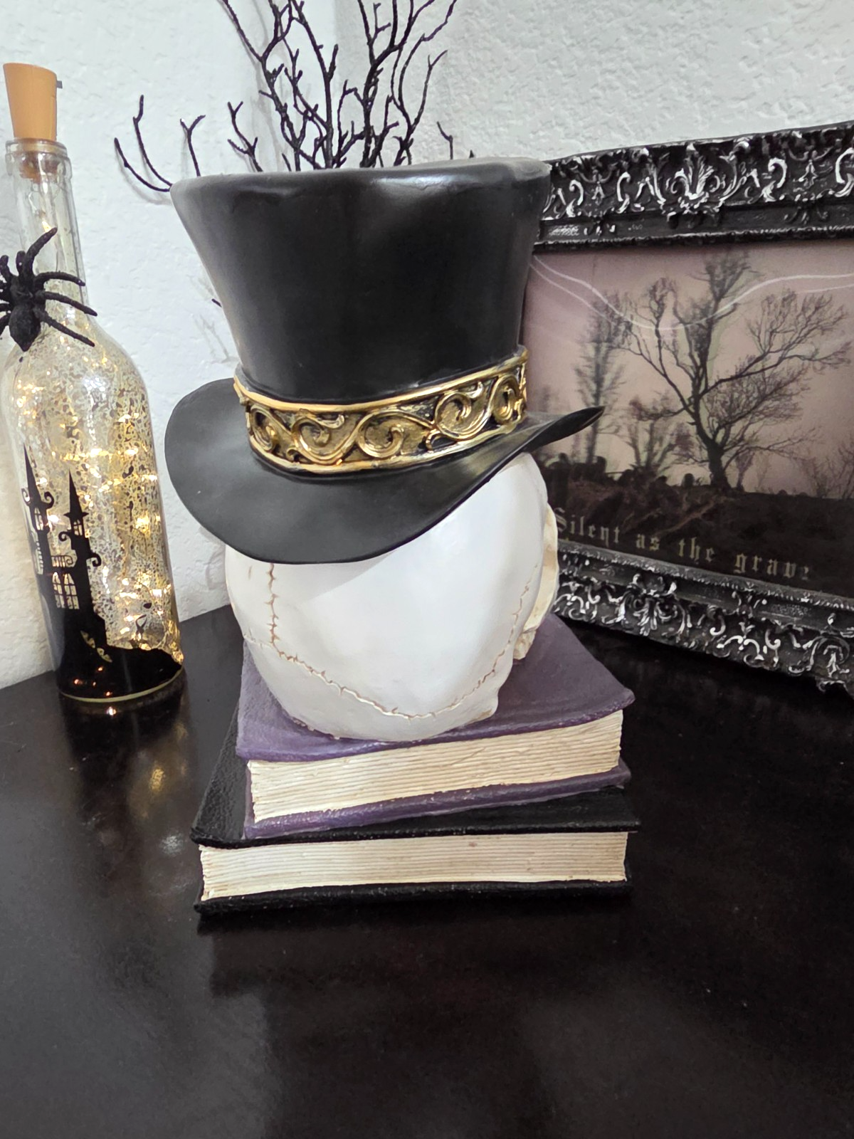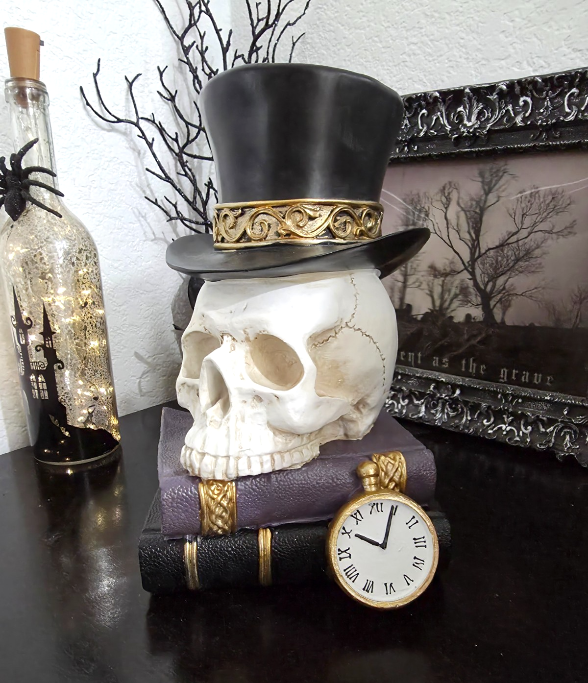 Halloween Skull Stacked Books Watch Top Hat Figurine Prop Decor 10"