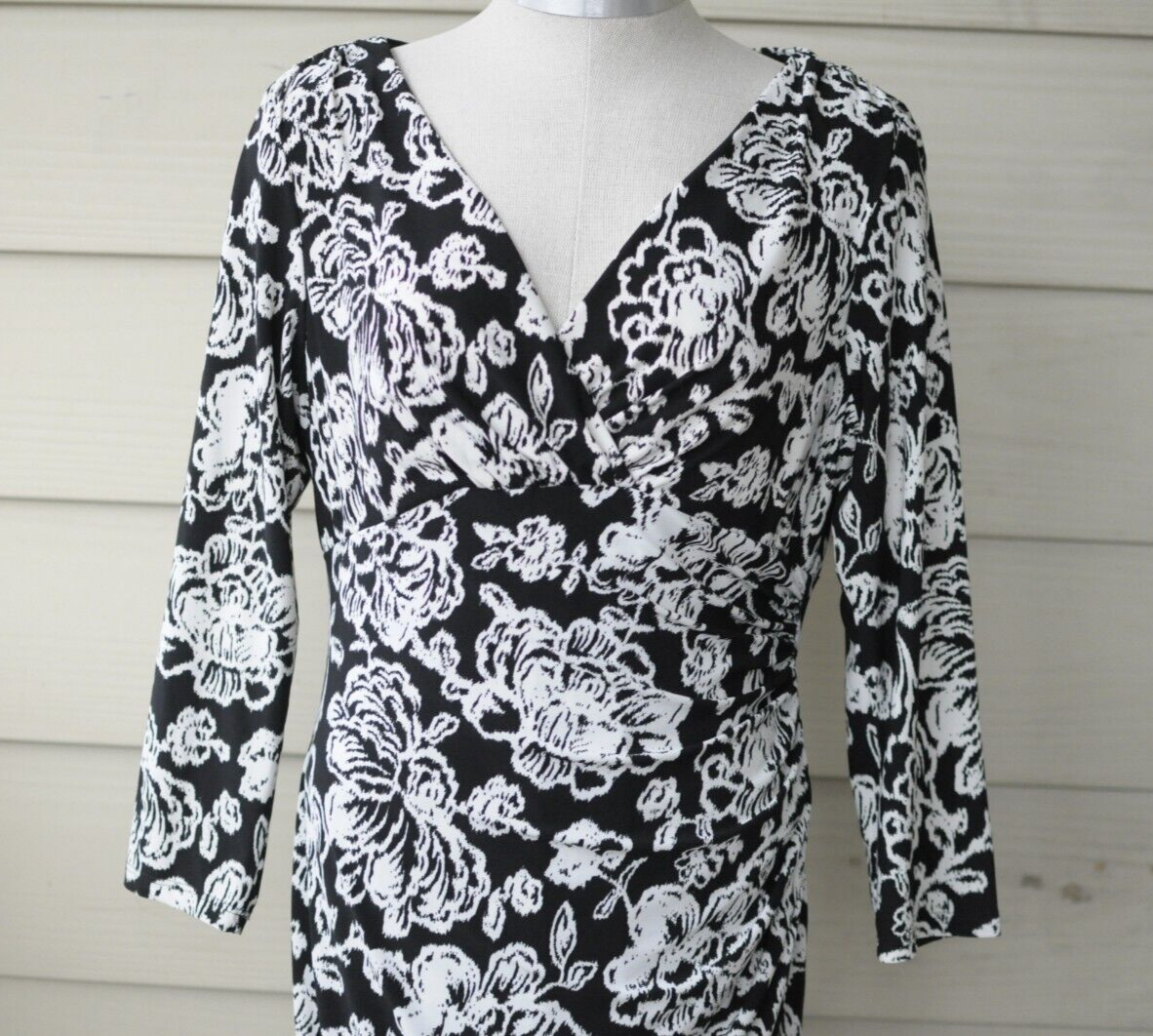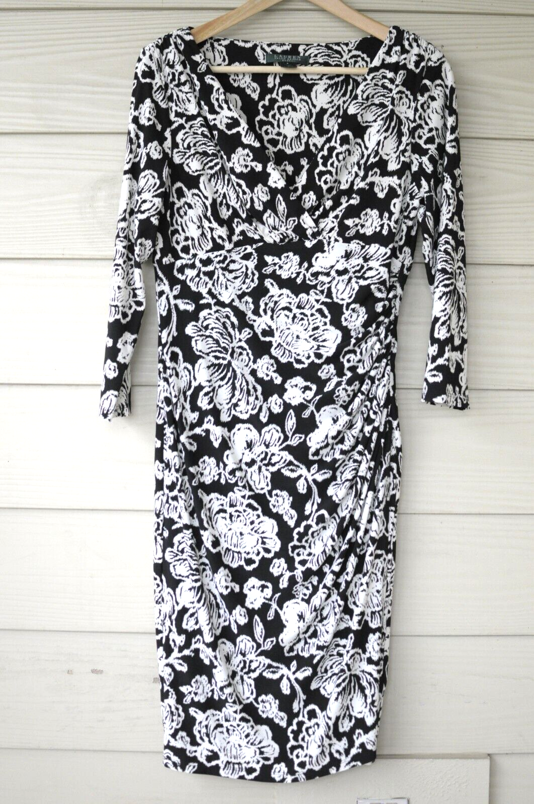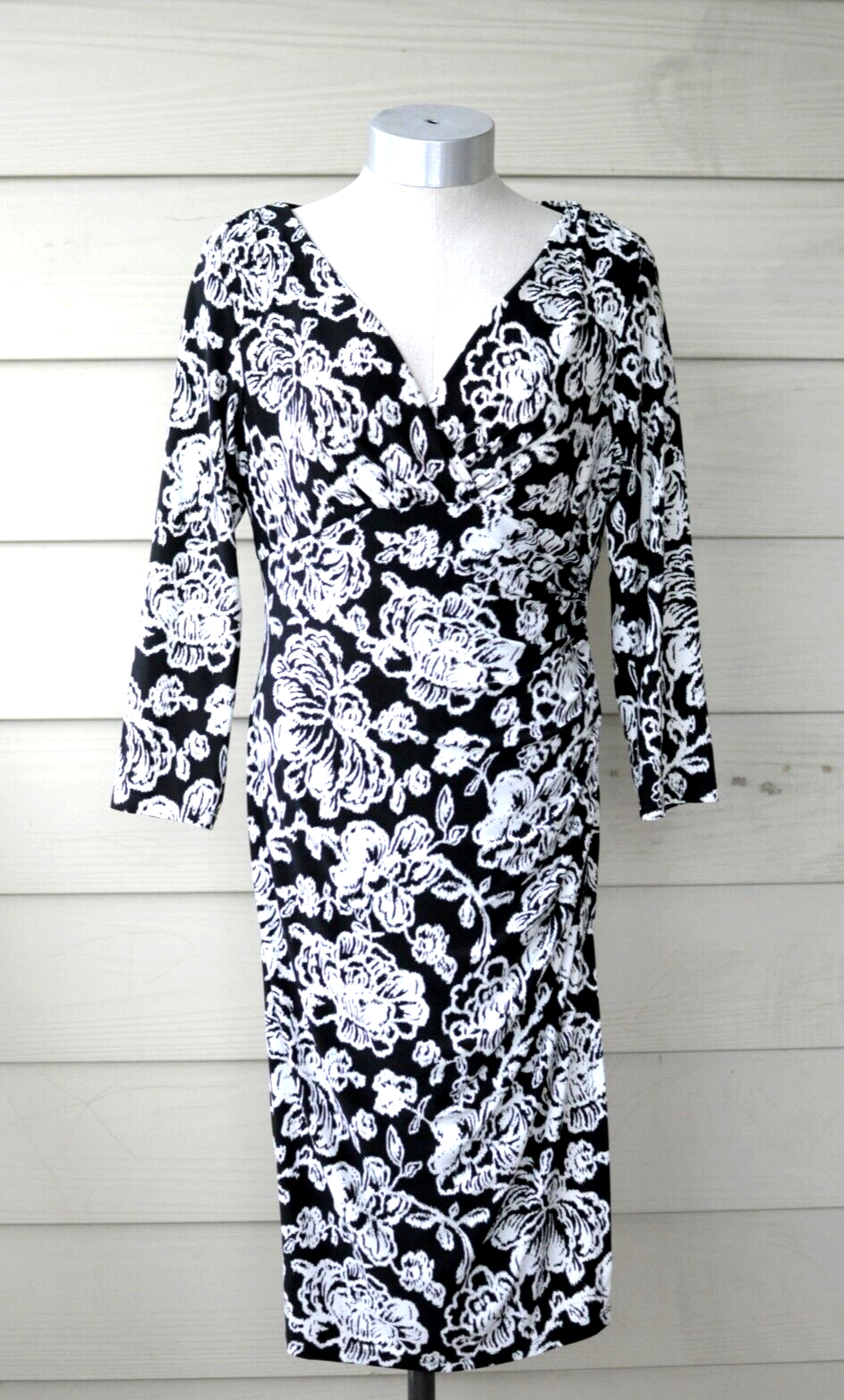Lauren Ralph Lauren Dress Floral V Neck 3/4 Sleeve Faux Wrap Black White Size 8