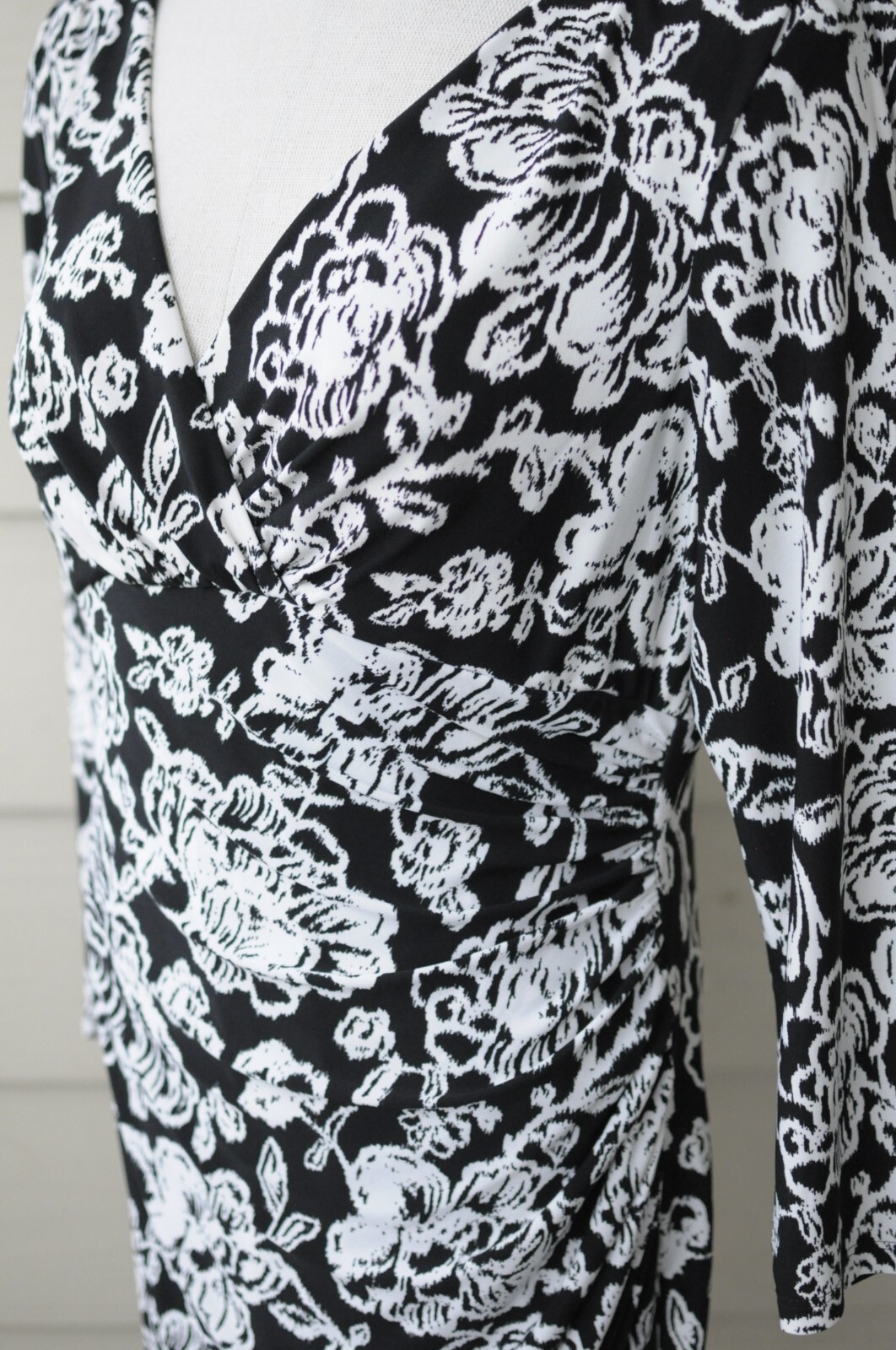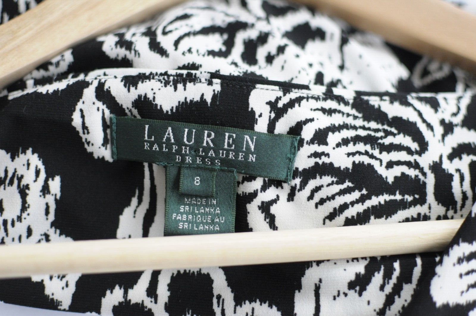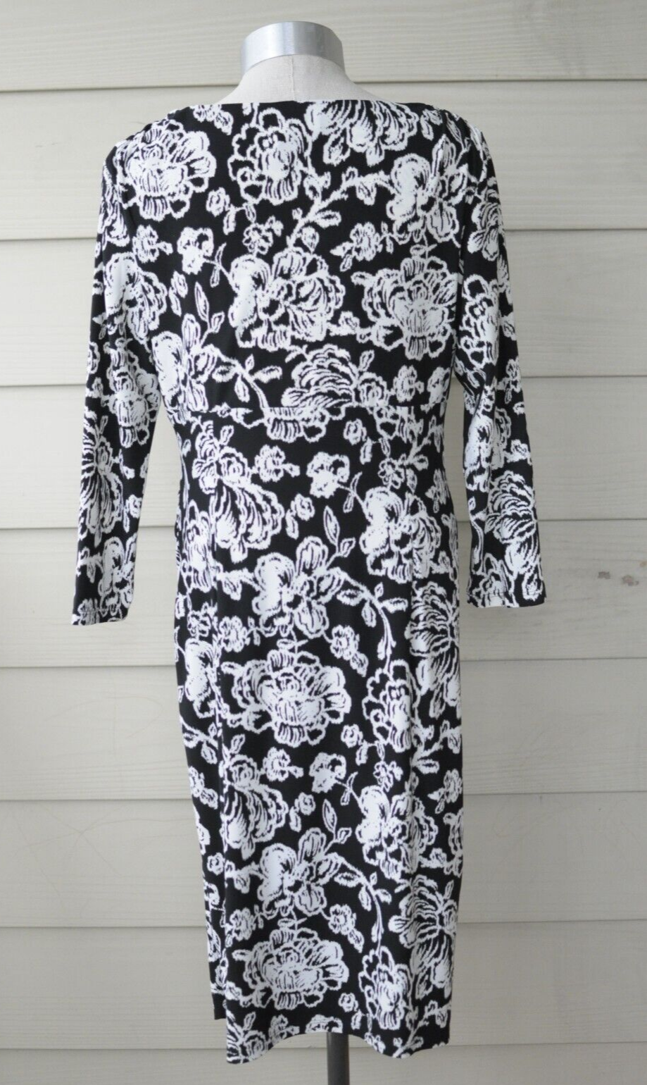 Lauren Ralph Lauren Dress Floral V Neck 3/4 Sleeve Faux Wrap Black White Size 8