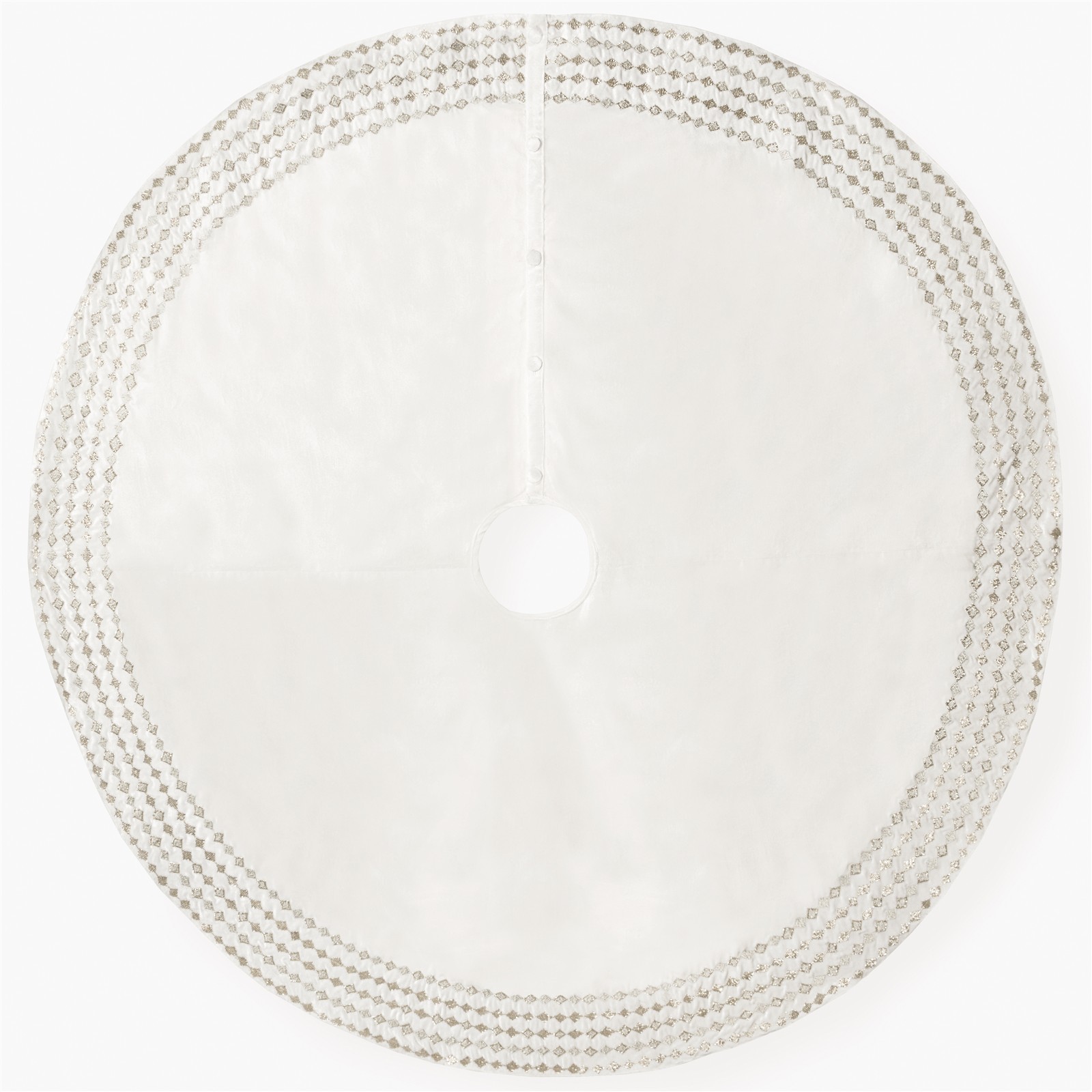 Intricate beadwork and metallic embroidery express Lucidoโs festive diamond pattern. The tree skirt can be personalized above the patterned border with a monogram.