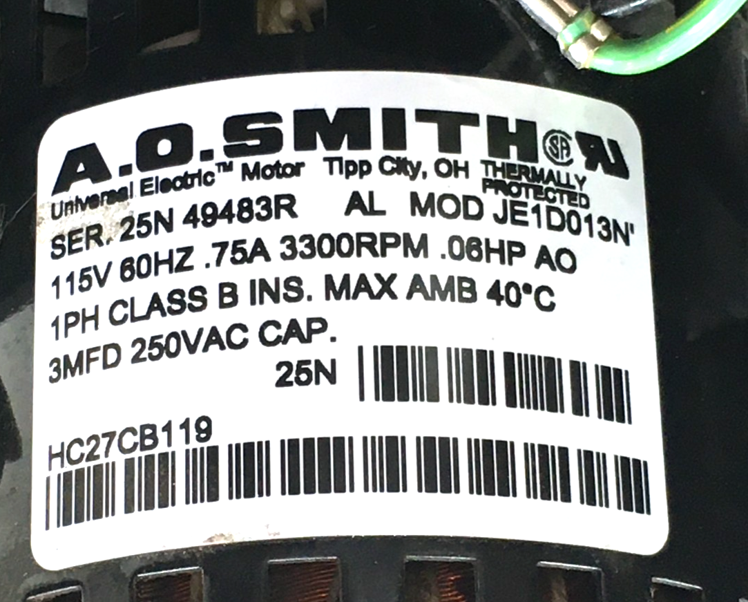 This is A.O. SMITH JE1D013N Carrier Bryant Draft Inducer Blower Motor HC27CB119 115V 3300 RPM .06HP used part.