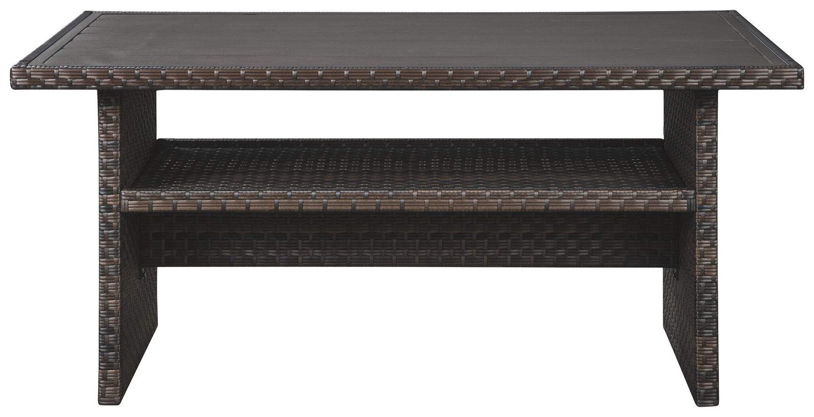 Alfresco living is easy to love with this multi-use table. Its raised height makes it perfect for mealtime, game time, a round of cards or a round of drinks. Resin wicker over a rust-free aluminum frame lends an upscale aesthetic that?s downright durable. Aluminum top is conveniently water and stain resistant.Additional Dimensions Apron to floor: 26" Opening: 0" Product Features All-weather resin wicker handwoven over rust-free aluminum frame Powder coated aluminum resists rusting and fading Aluminum tabletop Versatile outdoor coffee-dining table, great for game night or entertaining Lower shelf Assembly required Easy Isle - Dark Brown / Beige - RECT Multi-Use Table58.88"W x 33.38"D x 27.75"H - 1.0 lb