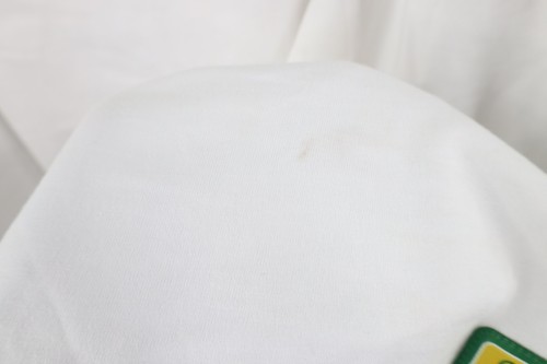 Stains front, back. Collar, shoulders discolored/sun faded. Collar, arms color faded. Pilling