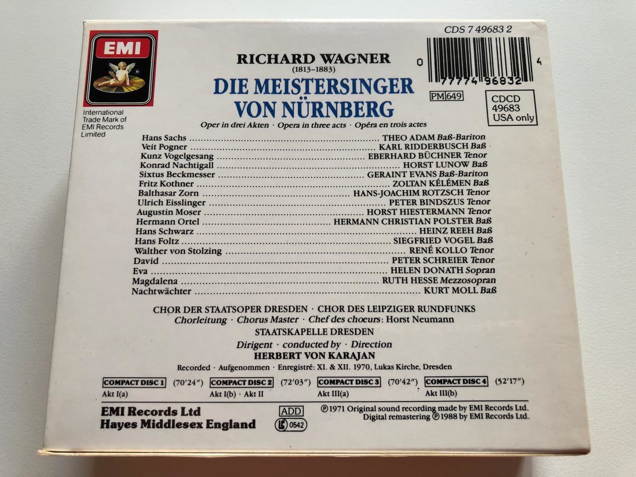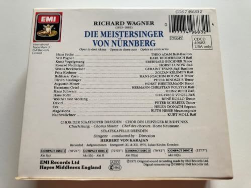 Product description: Karajan - Wagner - Die Meistersinger Von Nürnberg / Kollo, Donath, Adam, Evans, Schreier, Hesse. Ridderbusch / Chor der Staatsoper Dresden, Chor des Leipziger Rundfunks, Staatskapelle Dresden / EMI 4x Audio CD 1988 Stereo / 7 49683 2 UPC 077774968324 /// Die Meistersinger von Nürnberg (German: [di? ?ma?st??z??? f?n ?n??nb??k]; "The Master-Singers of Nuremberg"), WWV 96, is a music drama (or opera) in three acts, written and composed by Richard Wagner. It is among the longest operas commonly performed, usually taking around four and a half hours. It was first performed at the National Theatre Munich, today the home of the Bavarian State Opera, in Munich, on 21 June 1868. The conductor at the premiere was Hans von Bülow. The story is set in Nuremberg in the mid-16th century. At the time, Nuremberg was a free imperial city and one of the centers of the Renaissance in Northern Europe. The story revolves around the city's guild of Meistersinger (Master Singers), an association of amateur poets and musicians who were primarily master craftsmen of various trades. The master singers had developed a craftsmanlike approach to music-making, with an intricate system of rules for composing and performing songs. The work draws much of its atmosphere from its depiction of the Nuremberg of the era and the traditions of the master-singer guild. One of the main characters, the cobbler-poet Hans Sachs, is based on a historical figure, Hans Sachs (1494?1576), the most famous of the master-singers. Die Meistersinger von Nürnberg occupies a unique place in Wagner's oeuvre. It is the only comedy among his mature operas (he had come to reject his early Das Liebesverbot) and is also unusual among his works in being set in a historically well-defined time and place rather than in a mythical or legendary setting. It is the only mature Wagner opera based on an entirely original story, devised by Wagner himself, and in which no supernatural or magical powers or events are in evidence. It incorporates many of the operatic conventions that Wagner had railed against in his essays on the theory of opera: rhymed verse, arias, choruses, a quintet, and even a ballet. /// Label: EMI ? 7 49683 2 Format: 4 x CD, Album, Box Set Country: Germany Released: 1988 Genre: Classical Style: Romantic /// Tracklist: Die Meistersinger Von Nürnberg 1-01 Vorspiel 9:27 Erster Akt (Act One) Erste Szene (Scene One) 1-02 Da Zu Dir Der Heiland Kam 3:24 1-03 Verweilt! - Ein Wort! 4:38 1-04 Da Bin Ich! 4:06 Zweite Szene (Scene Two) 1-05 David, Was Stehst? 2:09 1-06 Mein Herr! Der Singer Meister-Schlag 2:53 1-07 Der Meister Ton' Und Weisen 5:57 1-08 Damit, Herr Ritter, Ist's So Bewandt 1:39 1-09 Aller End' Ist Doch David Der Allergescheit'st! 3:19 Dritte Szene (Scene Three) 1-10 Seid Meiner Frau Wohl Versehen 4:05 1-11 Gott Grüß Euch, Meister! 3:04 1-12 Das Schone Fest, Johannistag 6:40 1-13 Vielleicht Schon Ginget Ihr Zu Weit 5:20 1-14 Dacht' Ich Mir's Doch! 2:34 1-15 Am Stillen Herd In Winterszeit 5:06 1-16 Nun, Meister, Wenn's Gefallt 5:54 2-01 Fanget An! 3:26 2-02 Seid Ihr Nun Fertig? 2:25 2-03 Halt! Meister! Nicht So Geeilt! 7:33 Zweiter Akt (Act Two) Erste Szene (Scene One) 2-04 Johannistag! Johannistag! 4:00 Zweite Szene (Scene Two) 2-05 Laß Seh'n, Ob Meister Sachs Zu Haus? 5:27 Dritte Szene (Scene Three) 2-06 Zeig Her! - 's Ist Gut 0:49 2-07 Was Duftet Doch Der Flieder 5:27 Vierte Szene (Scene Four) 2-08 Gut'n Abend, Meister! 8:34 2-09 Hilf, Gott! Wo Bliebst Du Nur So Spat? 1:44 Fünfte Szene (Scene Five) 2-10 Da Ist Er! 4:07 2-11 Geliebter, Spare Den Zorn! 1:43 2-12 Üble Dinge, Die Ich Da Merk' 1:38 Sechste Szene (Scene Six) 2-13 Tu's Nicht! - Doch Horch! 0:57 2-14 Jerum! Jerum! 5:19 2-15 Das Fenster Geht Auf 7:45 2-16 Den Tag Seh' Ich Erscheinen 5:21 2-17 Mit Den Schuhen Ward Ich Fertig Schier! 5:44 Dritter Akt (Act Three) 3-01 Vorspiel 6:35 Erste Szene (Scene One) 3-02 Gleich, Meister! Hier! 4:10 3-03 Am Jordan Sankt Johannes Stand 3:23 3-04 Wahn! Wahn! Überall Wahn! 6:30 Zweite Szene (Scene Two) 3-05 Grüß Gott, Mein Junker! 4:50 3-06 Mein Freund! In Holder Jugendzeit 4:52 3-07 Morgendlich Leuchtet In Rosigem Schein 10:49 Dritte Szene (Scene Three) 3-08 Ein Werbelied! Von Sachs? - Ist's Wahr? 7:20 3-09 Das Gedicht? Hier Ließ Ich's 7:40 Vierte Szene (Scene Four) 3-10 Sieh, Evchen! 5:57 3-11 Hat Man Mit Dem Schuhwerk Nicht Seine Not! 5:55 3-12 Ein Kind Ward Hier Geboren 2:41 4-01 "Die Selige Morgentraum-Deutweise" 7:57 Fünfte Szene (Scene Five) 4-02 Sankt Crispin, Lobet Ihn! 4:17 4-03 Ihr Tanzt? Was Werden Die Meister Sagen? 5:47 4-04 Silentium! Silentium! 3:22 4-05 Euch Macht Ihr's Leicht, Mir Macht Ihr's Schwer 5:13 4-06 Nun Denn, Wenn's Meistern Und Volk Beliebt 6:30 4-07 Das Lied, Für Wahr, Ist Nicht Von Mir 4:41 4-08 Morgendlich Leuchtend Im Rosigen Schein 8:04 4-09 Verachtet Mir Die Meister Nicht 6:29 Choir ? Chor Der Staatsoper Dresden, Chor Des Leipziger Rundfunks Chorus Master ? Horst Neumann Composed By ? Richard Wagner Conductor ? Herbert von Karajan Orchestra ? Staatskapelle Dresden Producer ? Dieter-Gerhardt Worm Vocals [Augustin Moser] ? Horst Hiestermann Vocals [Balthasar Zorn] ? Hans-Joachim Rotzsch Vocals [David] ? Peter Schreier Vocals [Eva] ? Helen Donath Vocals [Fritz Kothner] ? Zoltan Kelemen Vocals [Hans Foltz] ? Siegfried Vogel Vocals [Hans Sachs] ? Theo Adam Vocals [Hans Schwarz] ? Heinz Reeh Vocals [Herman Ortel] ? Hermann Christian Polster Vocals [Konrad Nachtigall] ? Horst Lunow Vocals [Kunz Vogelgesang] ? Eberhard Büchner Vocals [Magdalene] ? Ruth Hesse Vocals [Nachtwachter / Nightwatchman] ? Kurt Moll Vocals [Sixtus Beckmesser] ? Geraint Evans Vocals [Ulrich Eisslinger] ? Peter Bindszus Vocals [Veit Pogner] ? Karl Ridderbusch Vocals [Walther Von Stolzing] ? Rene Kollo