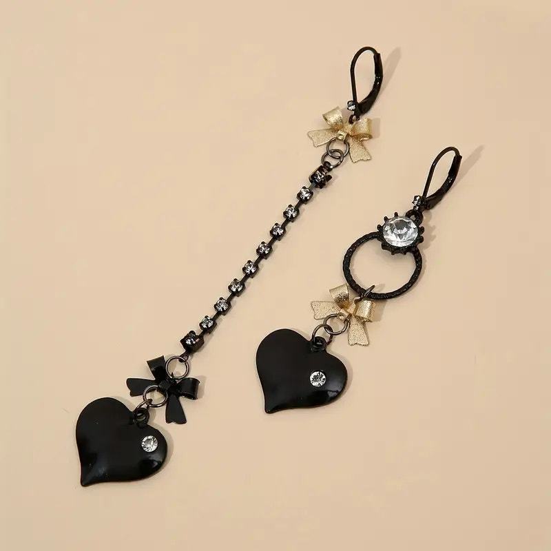 Gothic Asymmetrical Heart Drop Earrings – Black Enamel with Gold Bows