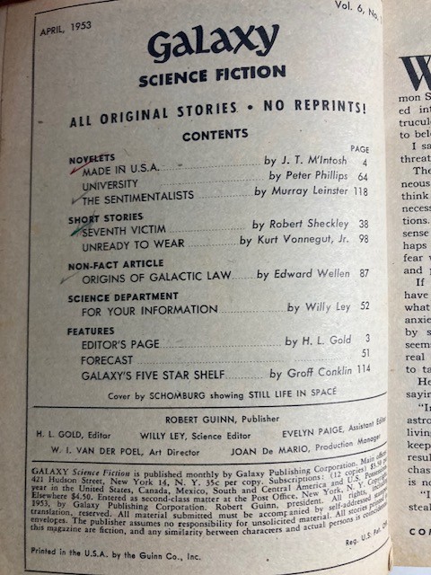 April 1953 Galaxy Science Fiction Volume 6 Number 1 Vonnegut