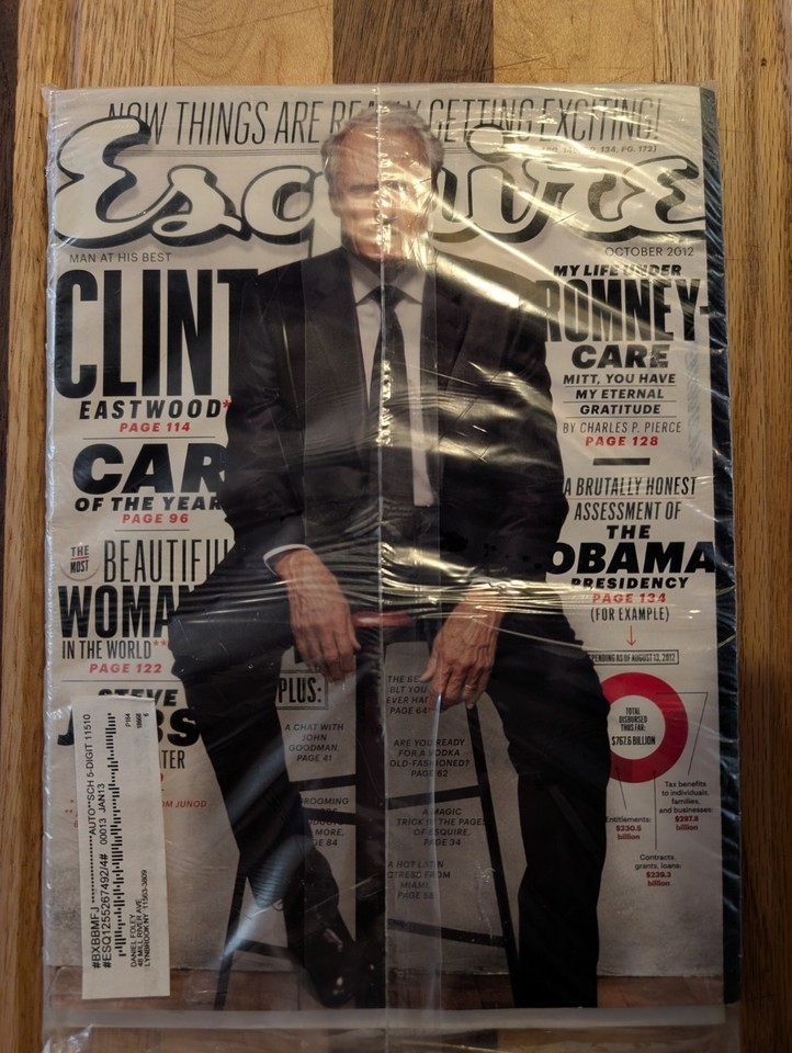 This is a brand new, factory-sealed copy of Esquire magazine from October 2012, featuring Clint Eastwood on the cover. Inside: Charles P. Pierce?s headline feature My Life Under Romneycare, plus a brutally honest look at politics, pop culture, and more. Perfect for collectors, fans of Eastwood, or anyone who appreciates bold journalism and sharp editorial design. Whether you're curating a vintage magazine collection or hunting for a great gift, this issue delivers.