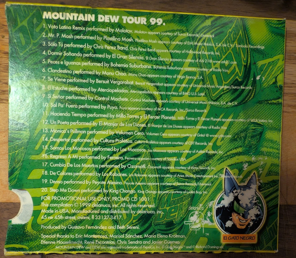 Rare Mountain Dew Tour ?99 promotional music CD featuring El Gato Negro on the cover. This collectible compilation includes 20 high-energy Latin rock and alternative tracks from some of the most influential bands of the late ?90s. Perfect for music lovers, collectors of promotional CDs, and Mountain Dew memorabilia fans.