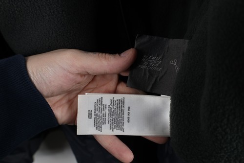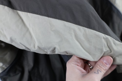 Stains throughout. Hood/collar, cuffs discolored. Blemishes inner collar. Color faded