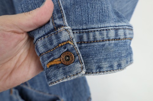 Thread bare front bottom, both cuffs. Bottom hem discolored. Loose threads inner lining, cuffs. Distressed and faded
