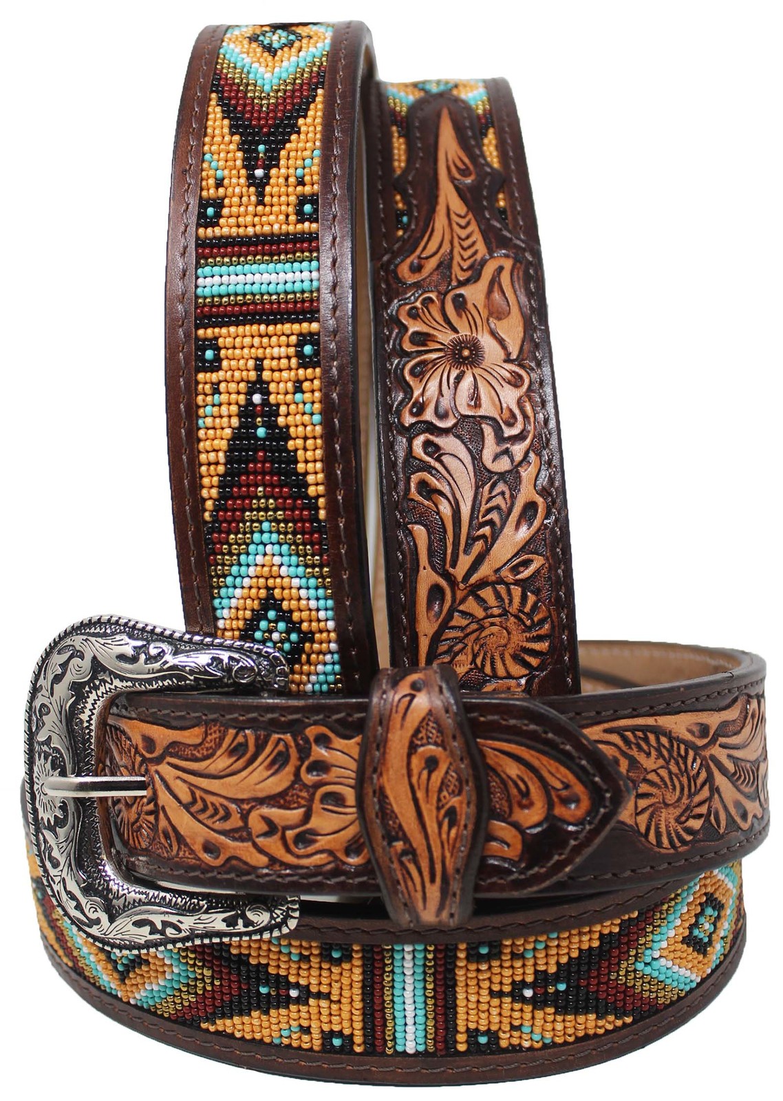 Western 1-1/2" Wide Floral Tooled Beaded Full-Grain Leather Belt 26RS23