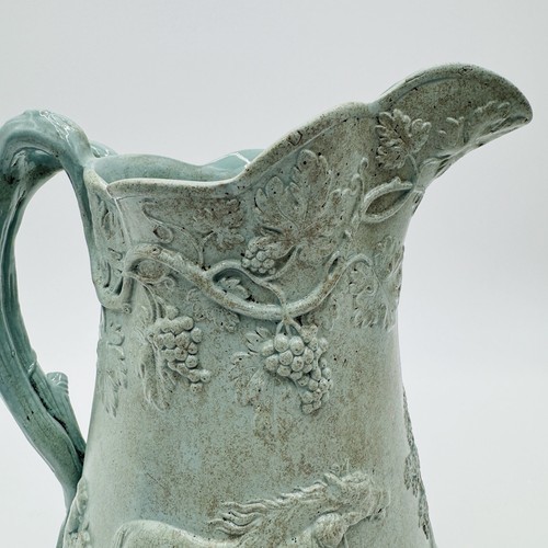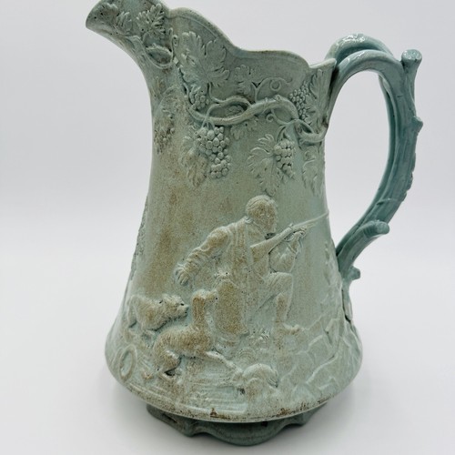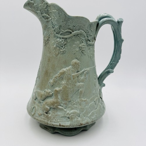 19th.c blue Parian salt glaze pottery pitcher w/embossed "Ranger" scene of hunter and dogs, figural grapevine handle by Edward Wallley