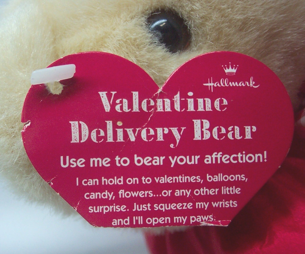 This is a Vintage VALENTINE DELIVERY TEDDY BEAR Plush Stuffed Animal Toy. Made by Hallmark. It is 12 inches tall. It has clips inside his hand so he can hold things! It is in Great Condition with part of the original tag. Combine auctions to save on shipping. EAG
