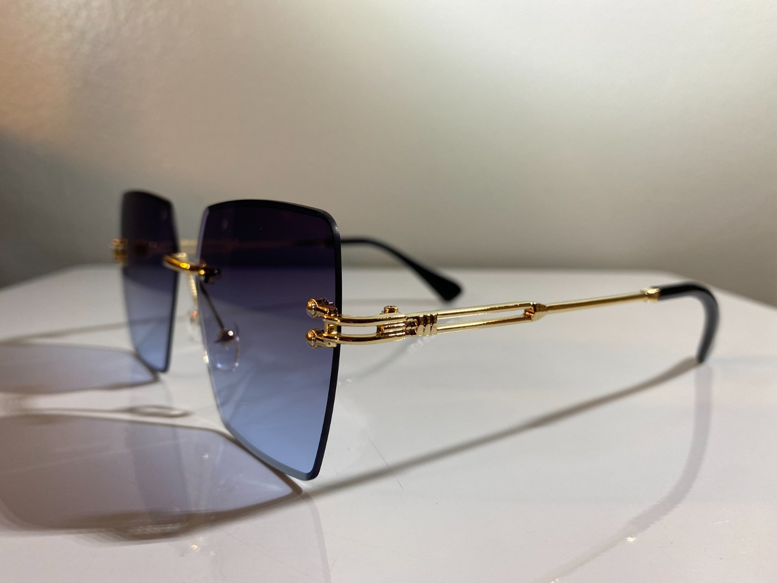 Unisex, rimless, oversized sunglasses with purple lenses and gold wire frame.