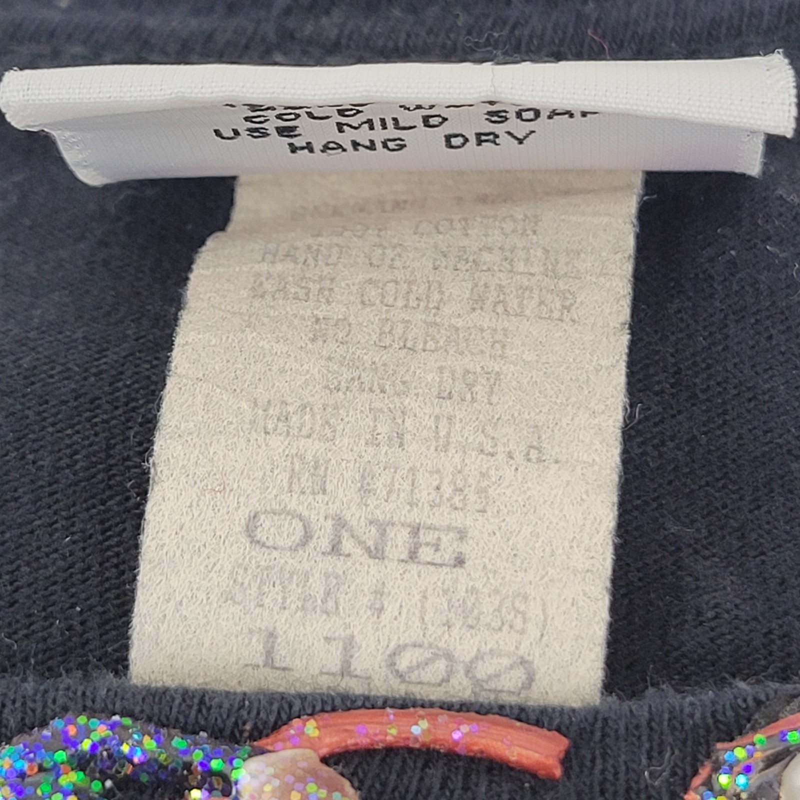 Condition: Pre-owned. The top shows noticeable cracking and peeling in the embellished design (see close-up photos). The pants are in better shape with less wear. Still a fun and rare vintage set with plenty of character. Pants also have cracking and peeling on design.