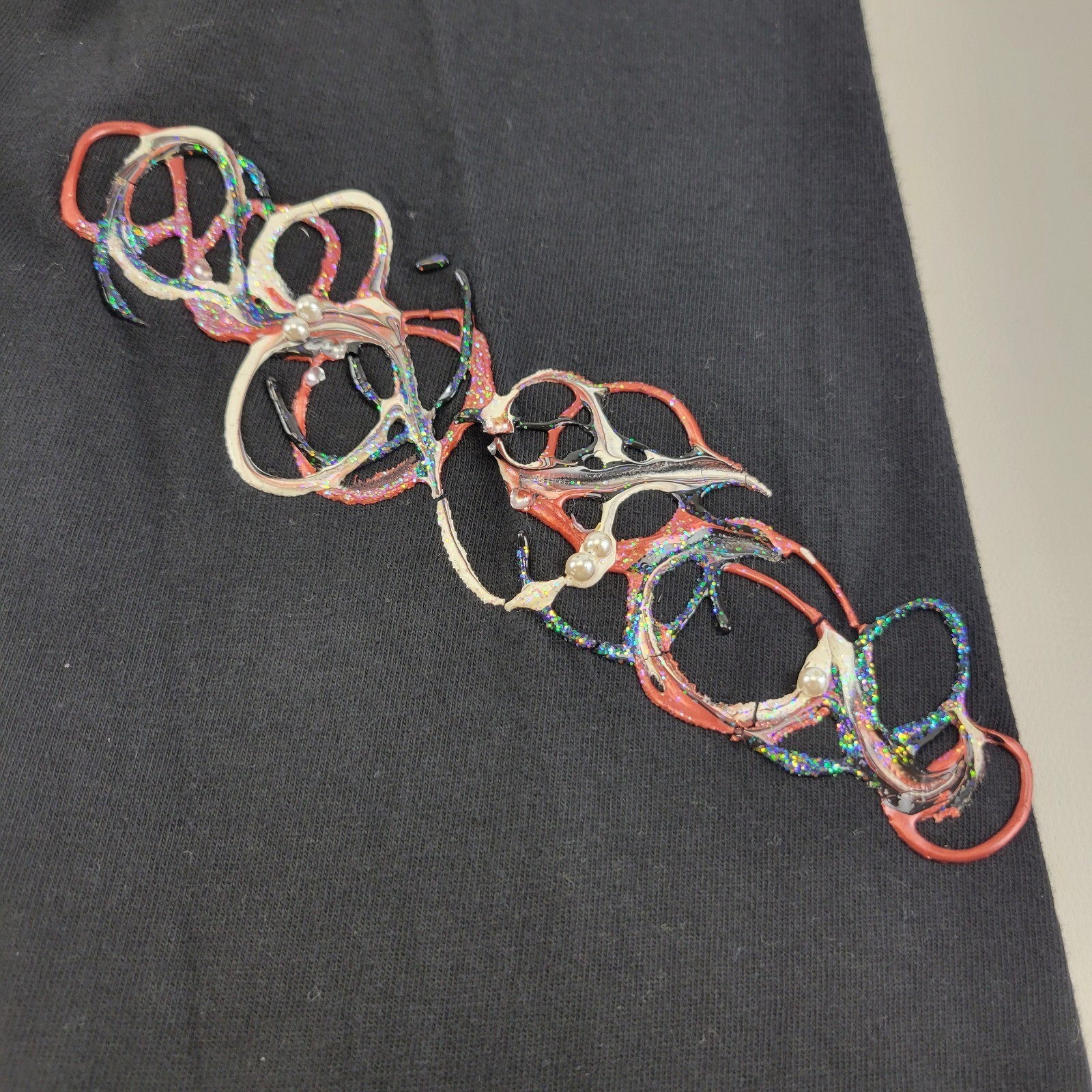 Step back into vintage style with this unique matching set from Fast Fashion of California. The set includes a black long sleeve top and coordinating pants, both crafted from 100% cotton for comfort. The design features hand-applied glitter paint accents and faux pearl embellishments that give it a true 80s festival retro vibe.