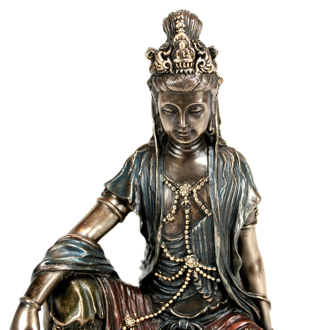This beautiful statue of the Buddhist goddess Kwan Yin is made from cold cast resin that is bronze plated. It is a high quality statue made with superior craftsmanship and has excellent details.