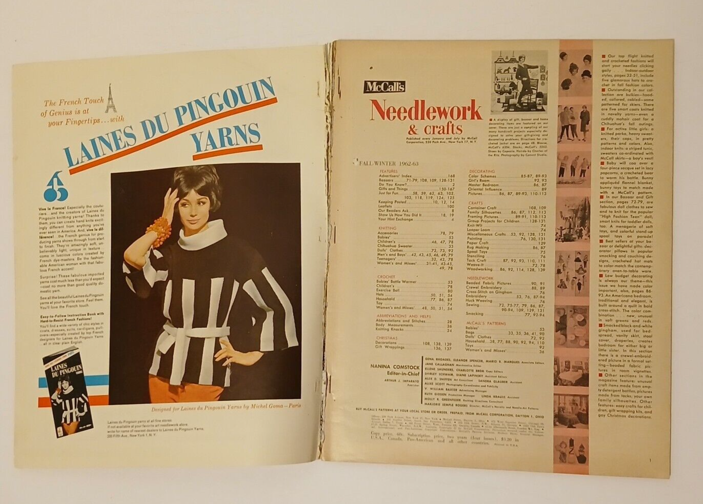This listing is for an original copy of McCall Needlework Crafts Magazine. This is the Fall/Winter 1962-1963 issue. The cover has minor shelf wear. The pages are clean. There are no missing or torn pages. Pages may have water stains, and or some yellowing due to age. Some edges may be frayed. There is some tearing along the spine.