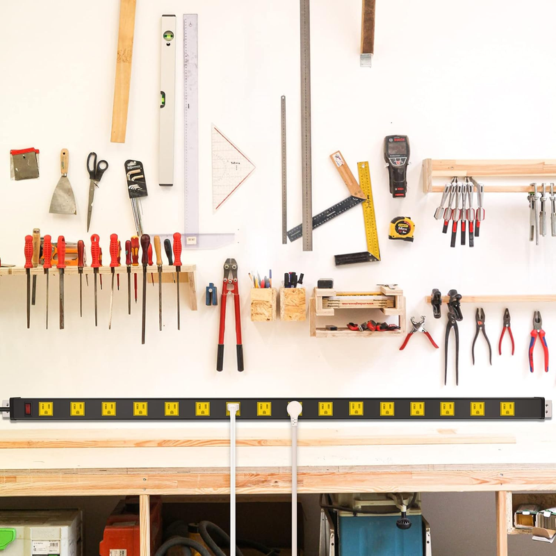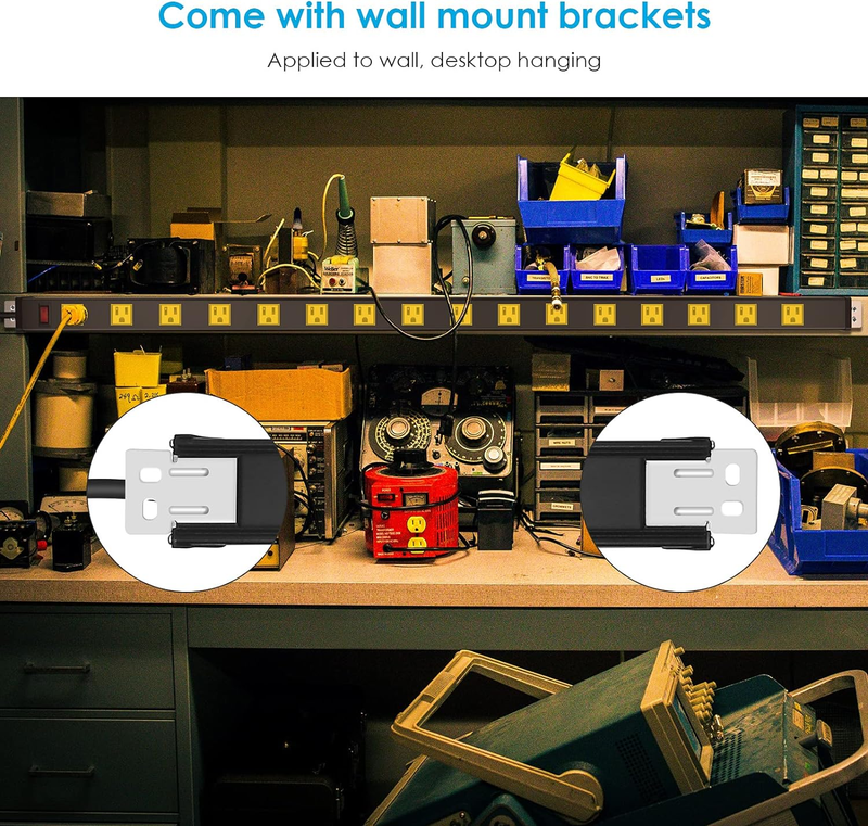 Heavy duty power strip come with mounting brackets to mount on the wall, for workshop, garage, commercial, shop, industrial use.