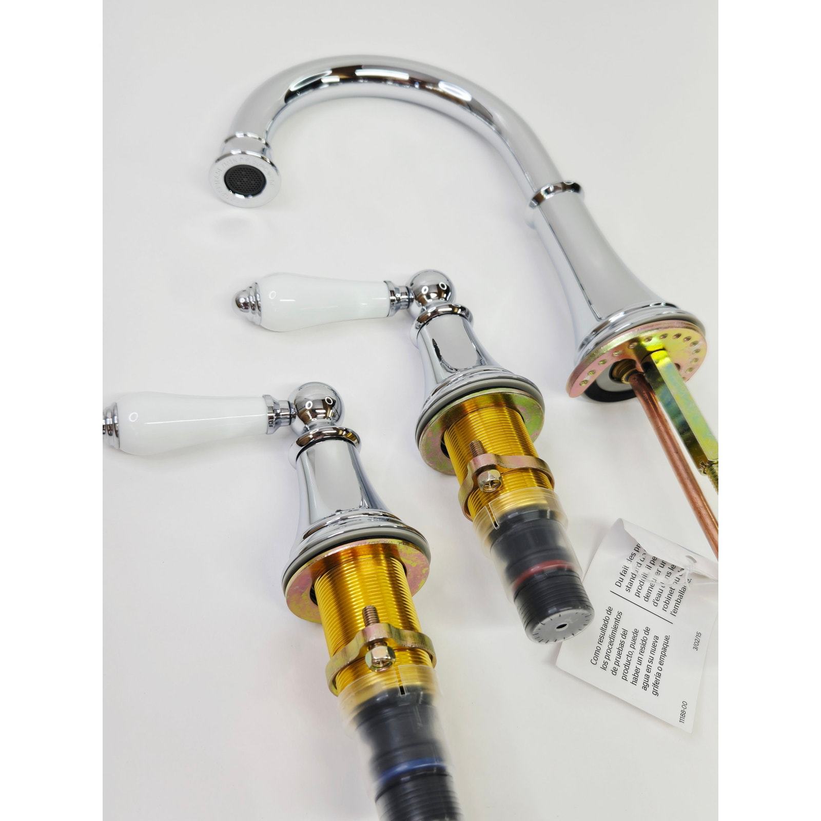 Widespread bathroom sink faucet: features three separate pieces - two handles and a spout - for bathroom sinks or vanity tops with three holes that are at least six inches apart; includes valve and cartridge