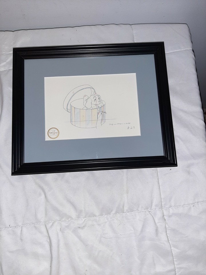 Classics of Walt Disney Collection Pencil Sketch Lady and the Tramp. Lady in the Hat Box as a Christmas Gift to Darling. This is matted and framed. Marked A-23, with seq- seq-1- 2084. This is in a 9x11 inch frame. The visible art inside the matting measures approximately 4.8x6.85 inches.