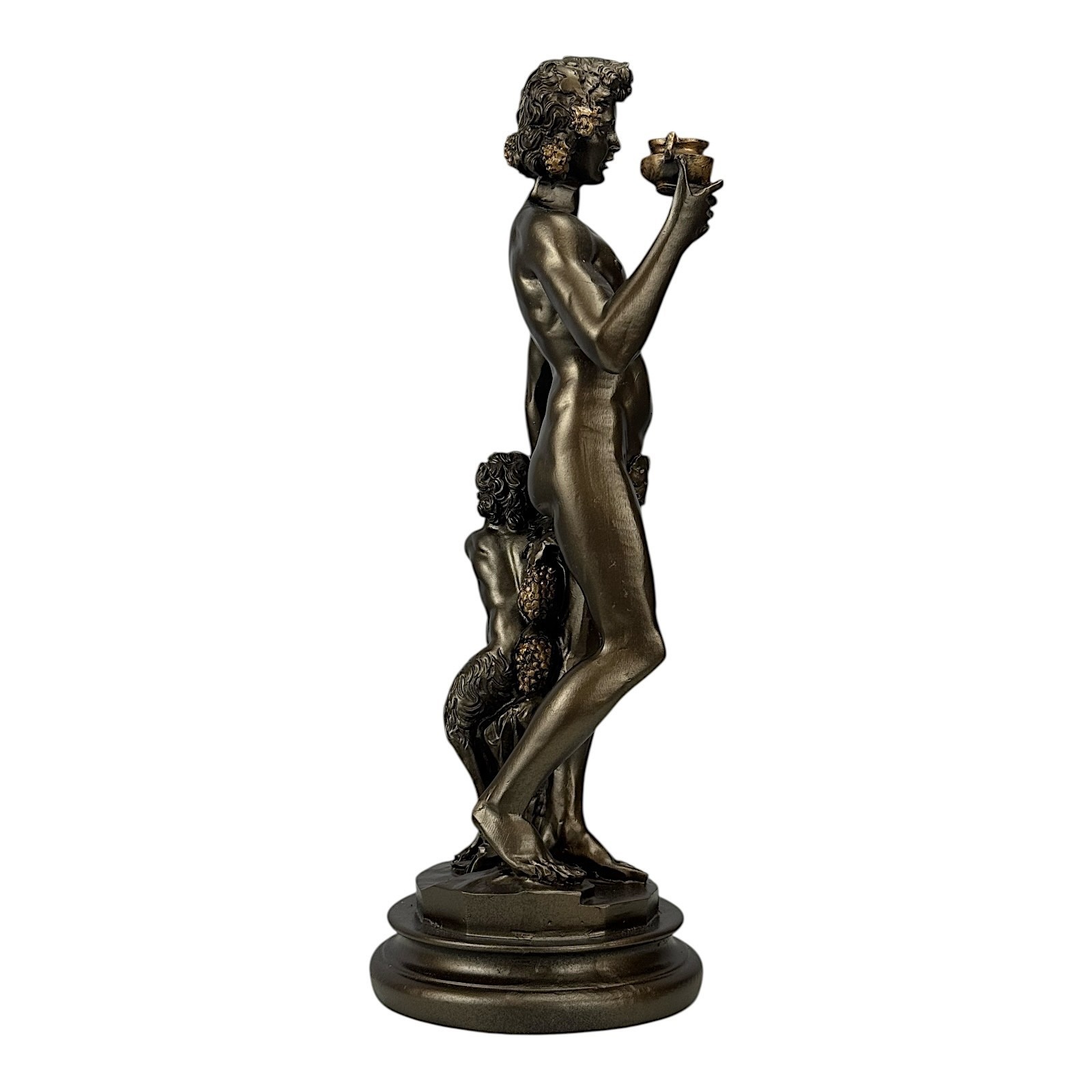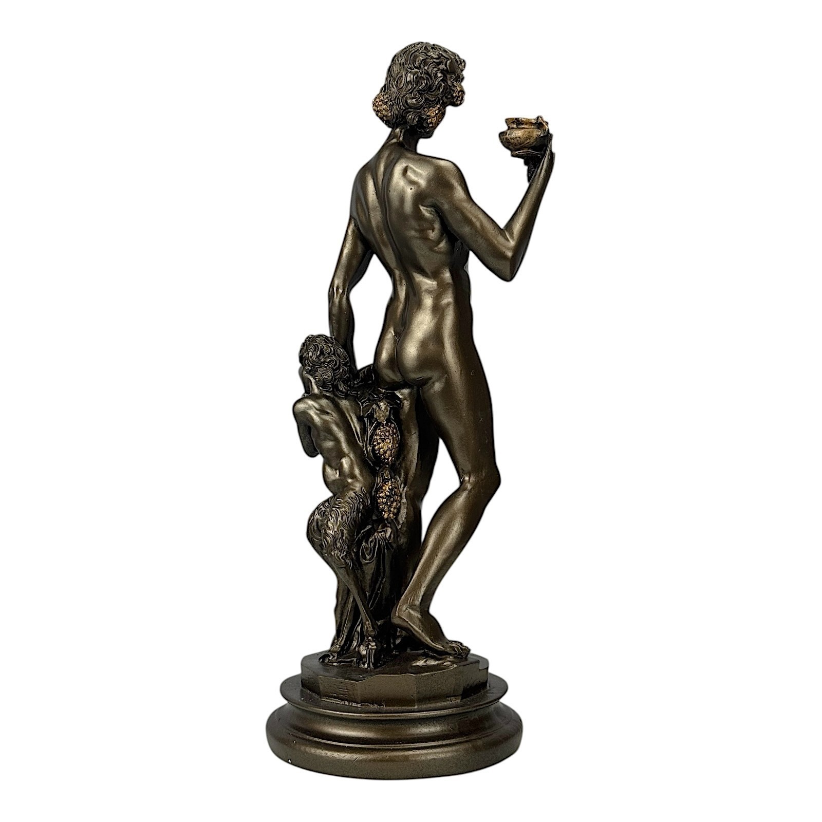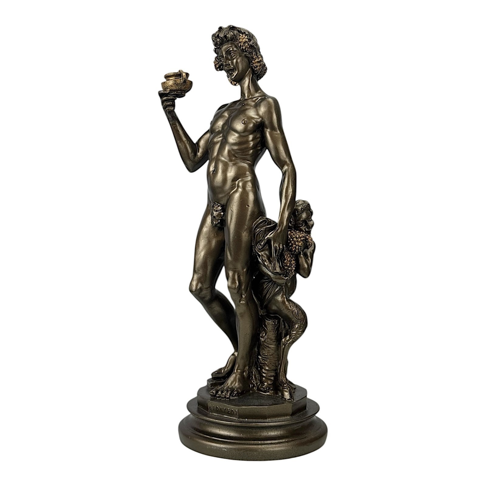 Esta exquisita escultura es un homenaje a "Baco de Miguel Angel", la famosa obra maestra del Renacimiento alojada en el Museo Nazionale del Bargello en Florencia. Representa Dioniso (Baco), el dios griego/romano del vino, la celebracion y el extasis, acompañado por un fauno travieso.