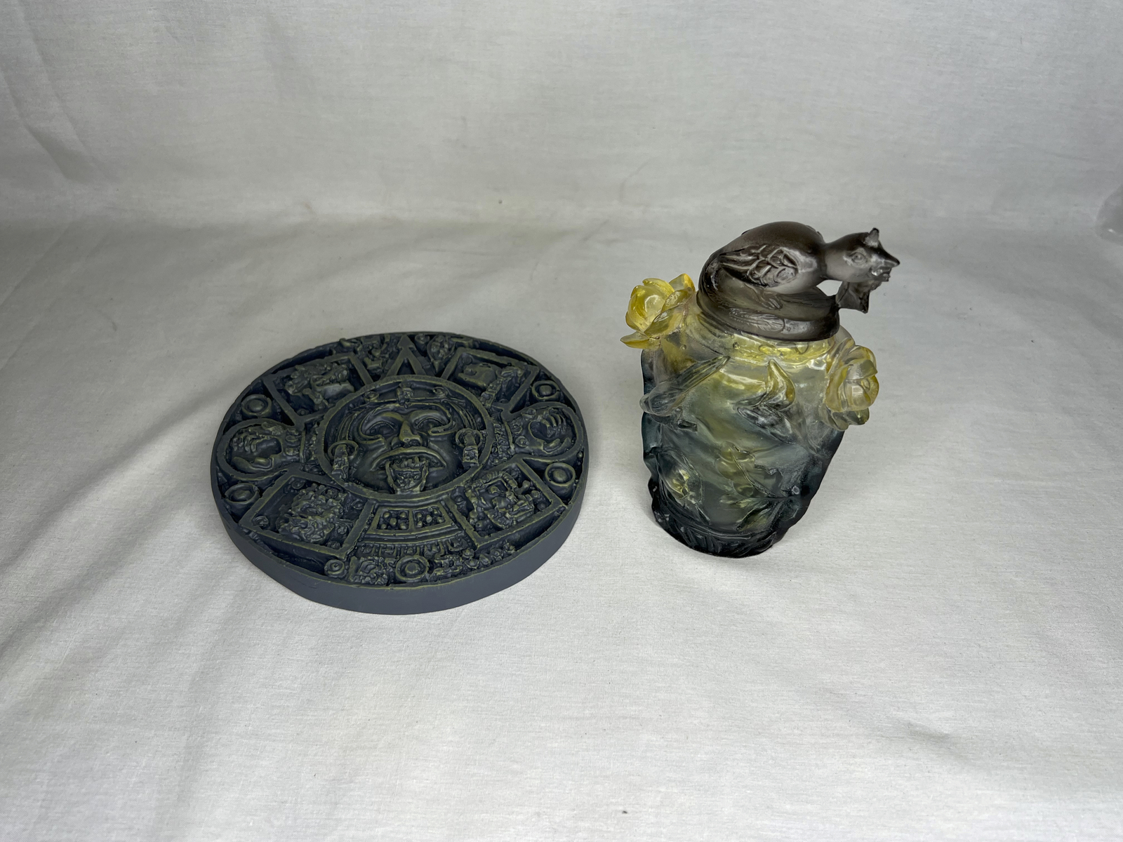 The Prop Replica Nurhachi Urn also comes with a Circular Jungle Display Stand to Exhibit your Collectables on. The Plaque itself has an Aztec, Mayan, Inca, Pre-Columbian type Artwork applied to it. It is Antique Gray in Color, Made out of a Solid Resin, Weighs almost 2lbs and Measures: 7 inches in Diameter x 1.5 inches thick. The Stand is Very Detailed and also Very Durable.