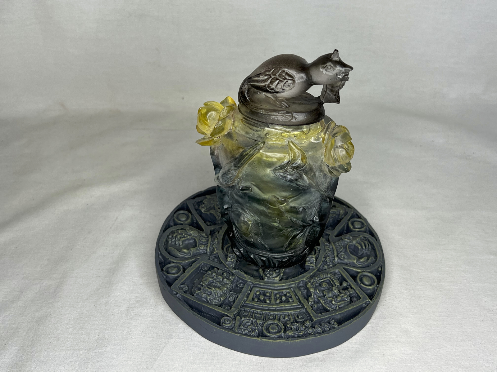This Prop Replica Nurhachi Urn is identical to the one seen in the film. It is made out of Clear Resin that is Colored Green and measures; 5.5 Inches tall x 3.5 inches Wide x 2.5 Inches Deep. The Cap is removable.