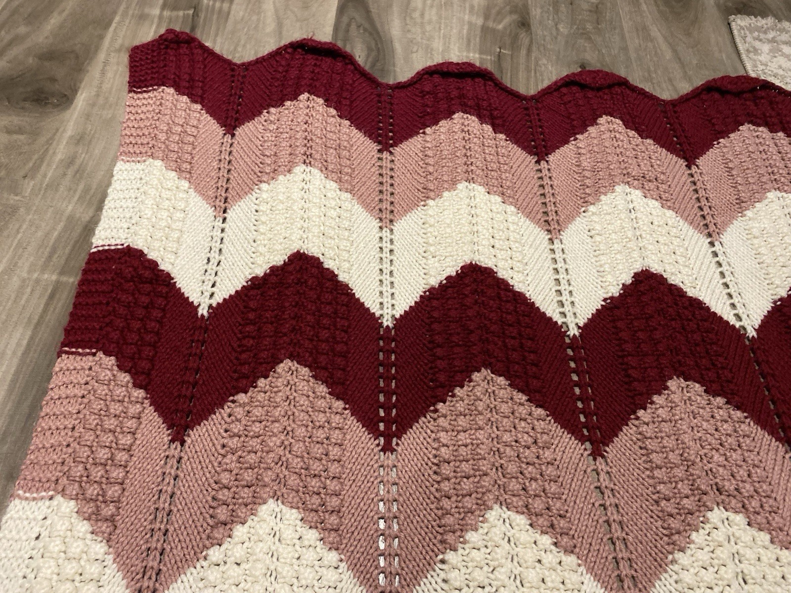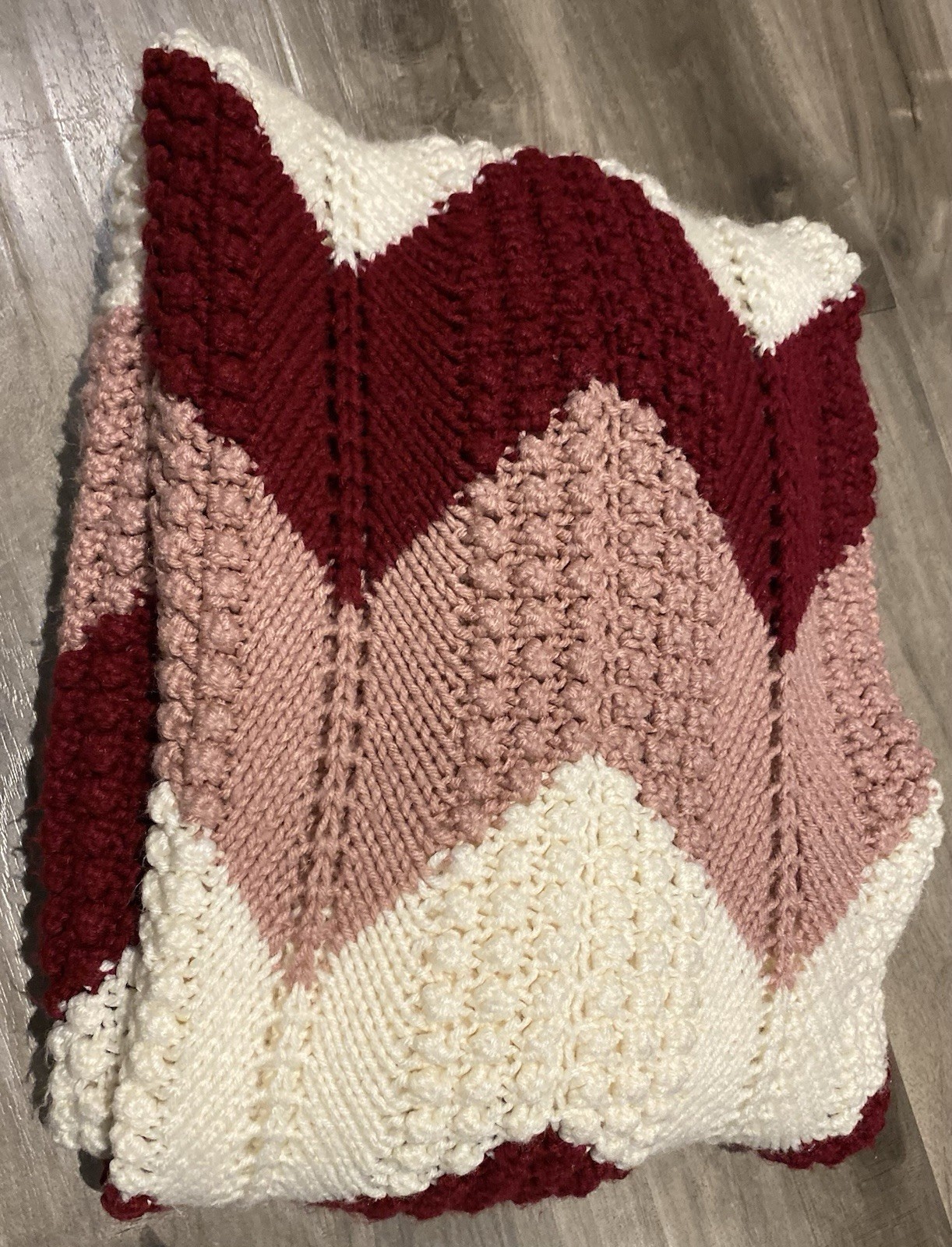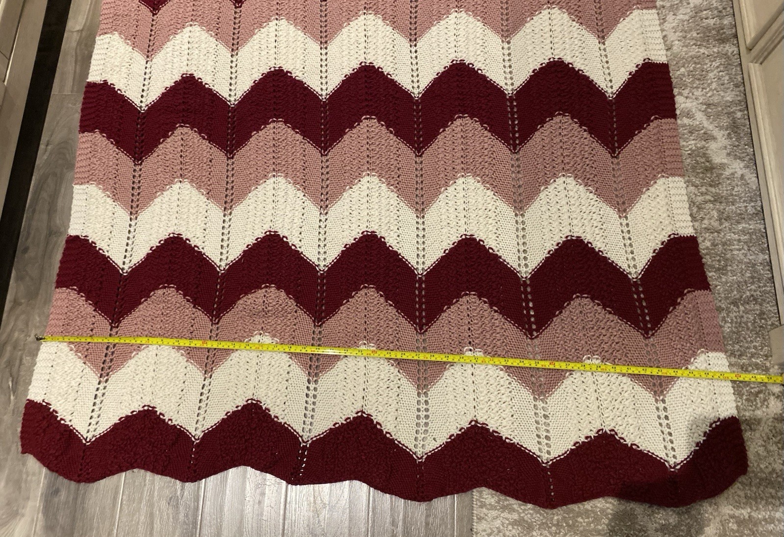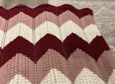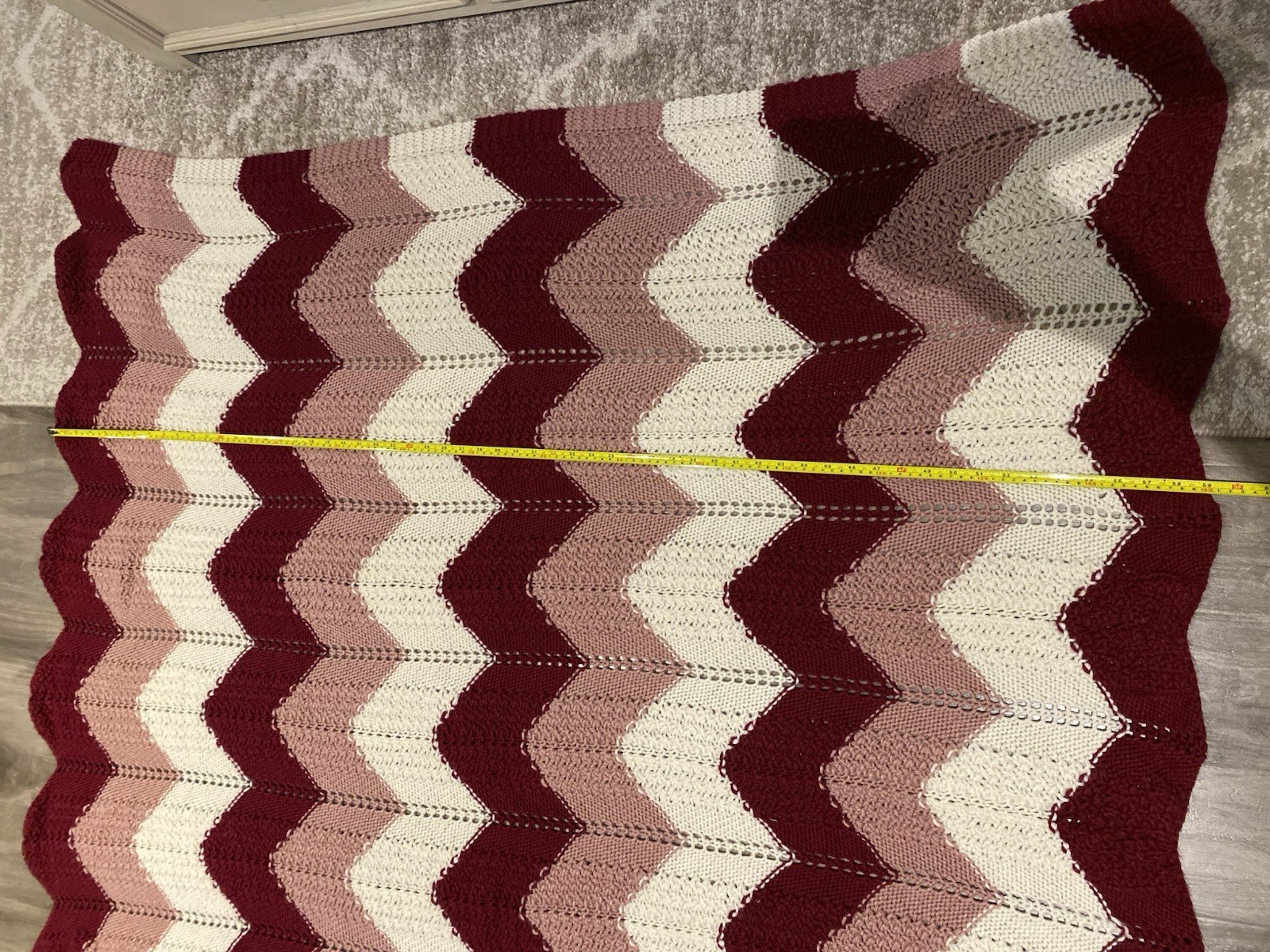 Handmade 59”X47” Afghan Crocheted Chevron Zig-Zag Pattern Maroon Mauve And White