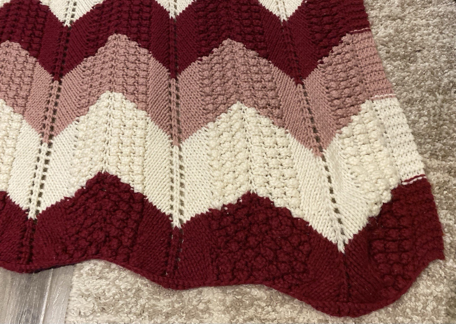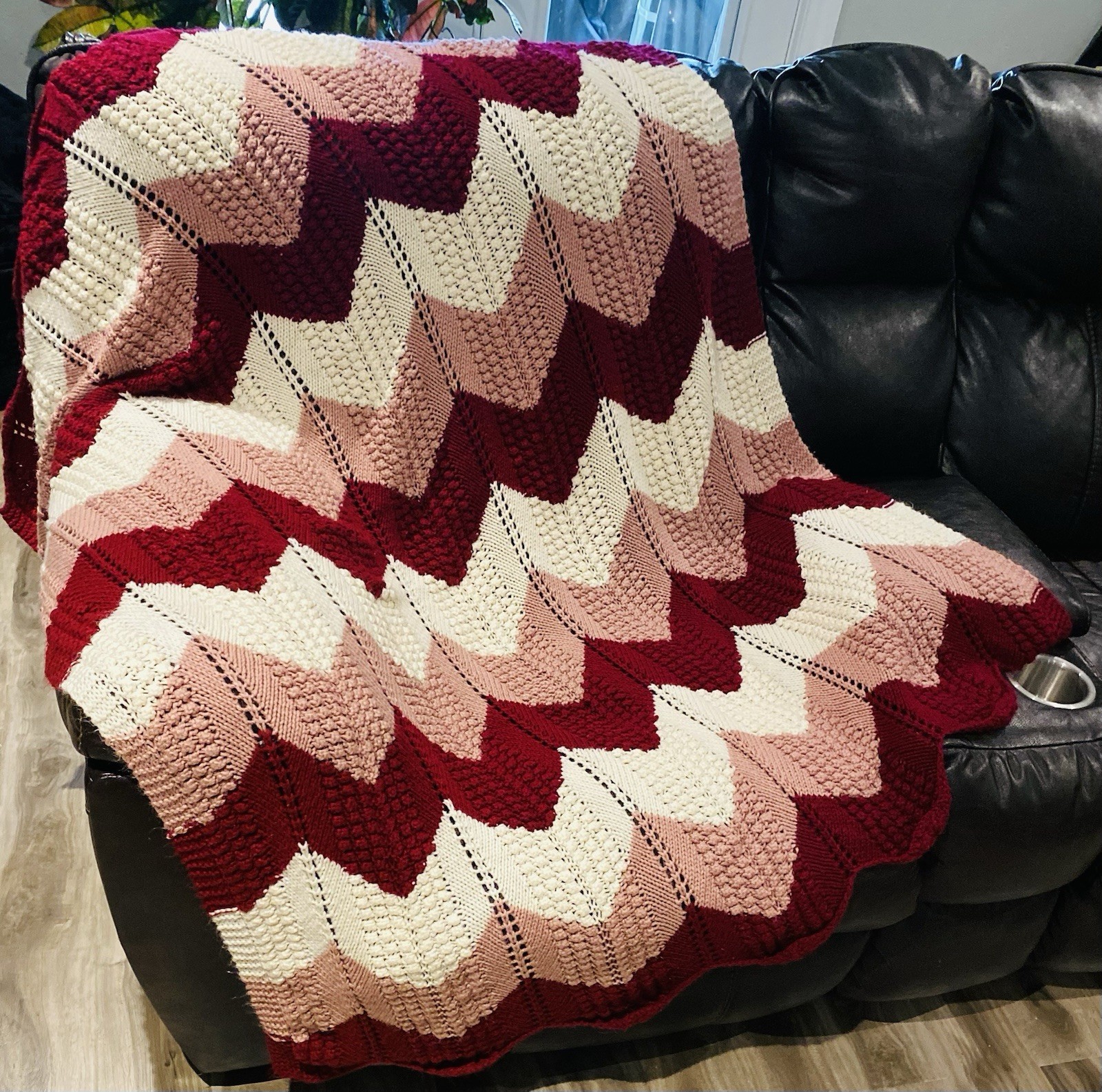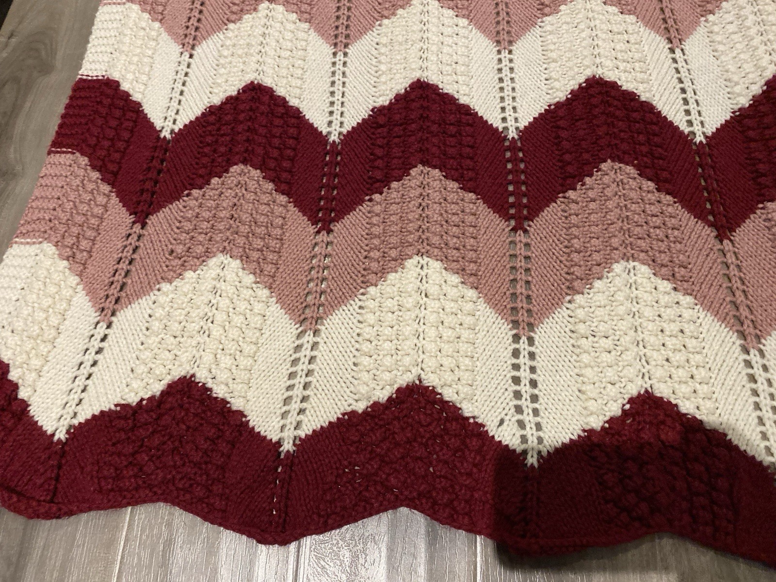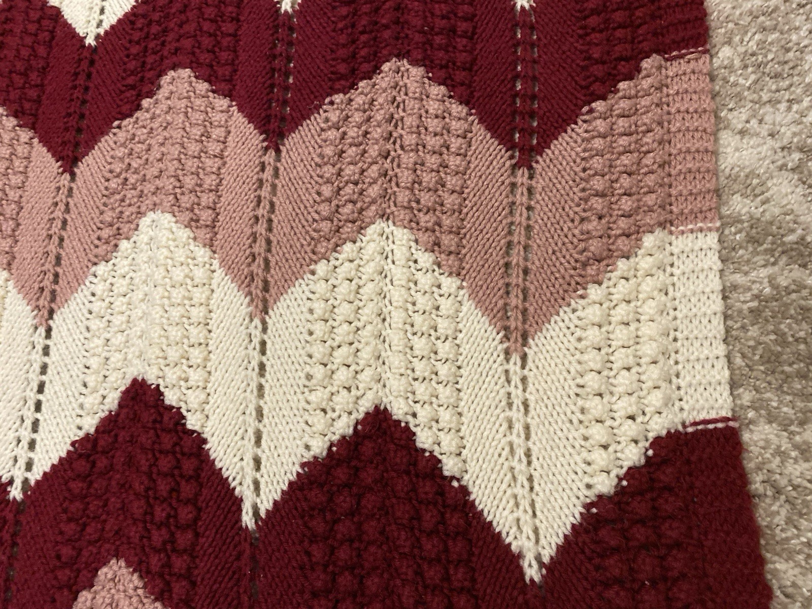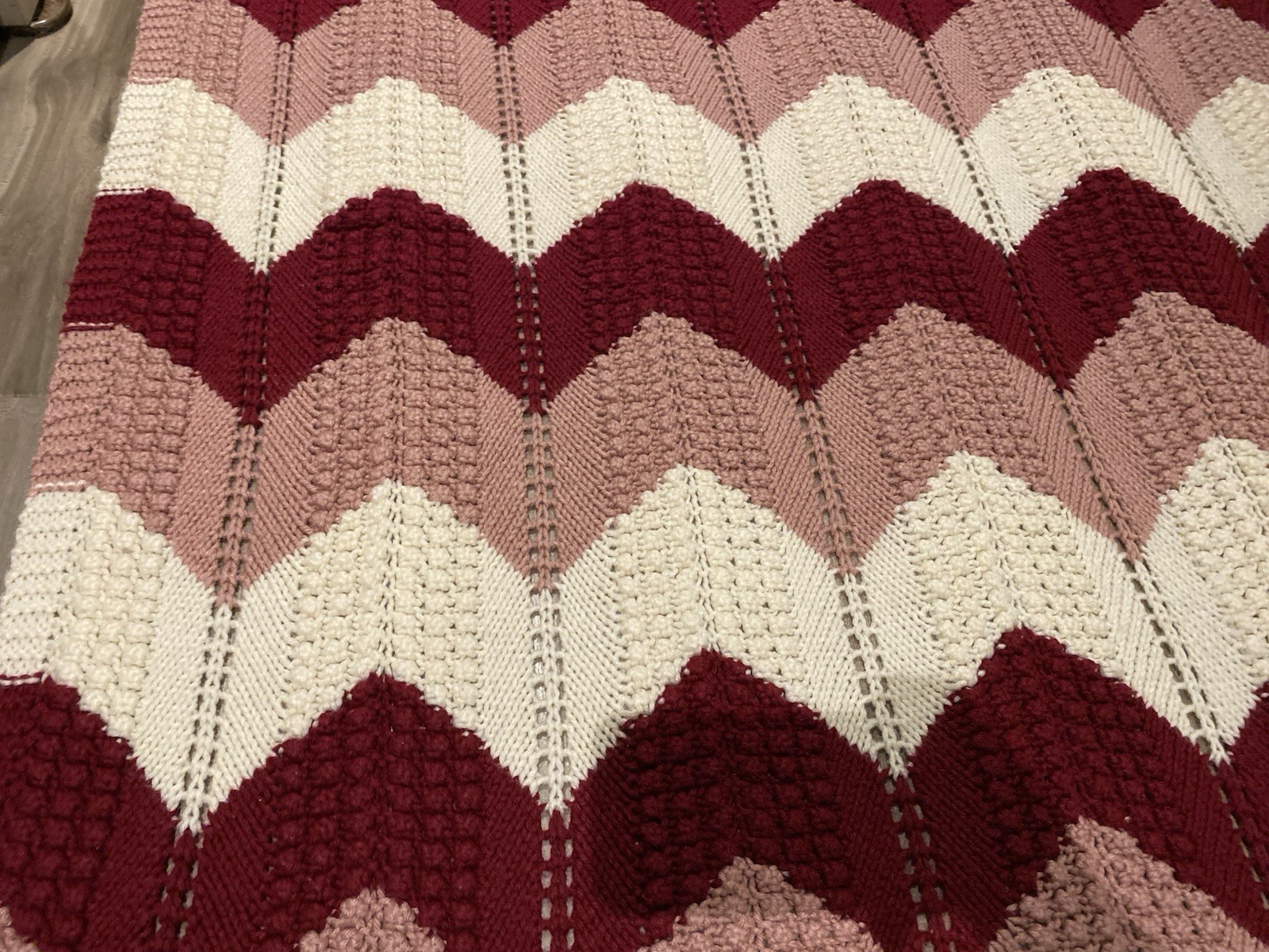 Handmade 59”X47” Afghan Crocheted Chevron Zig-Zag Pattern Maroon Mauve And White
