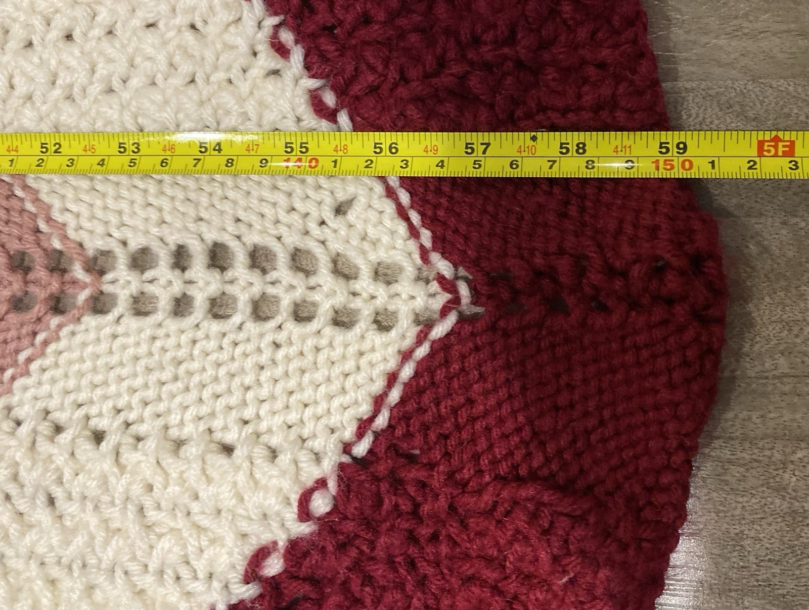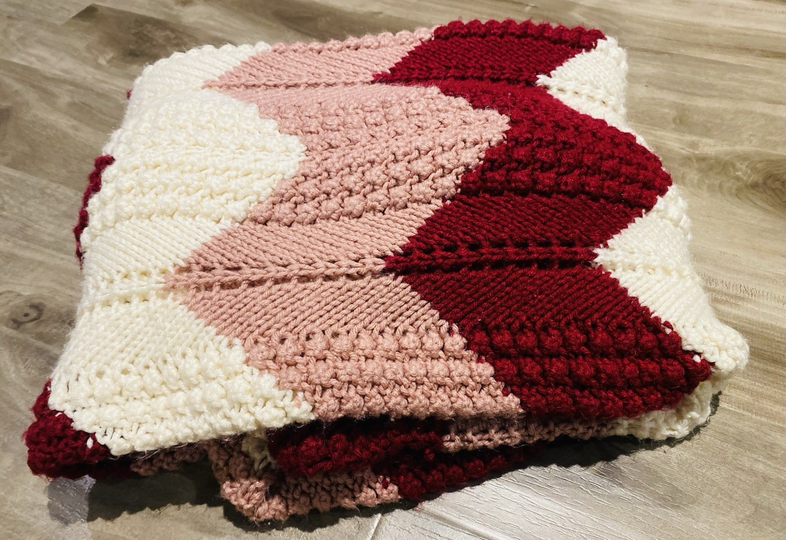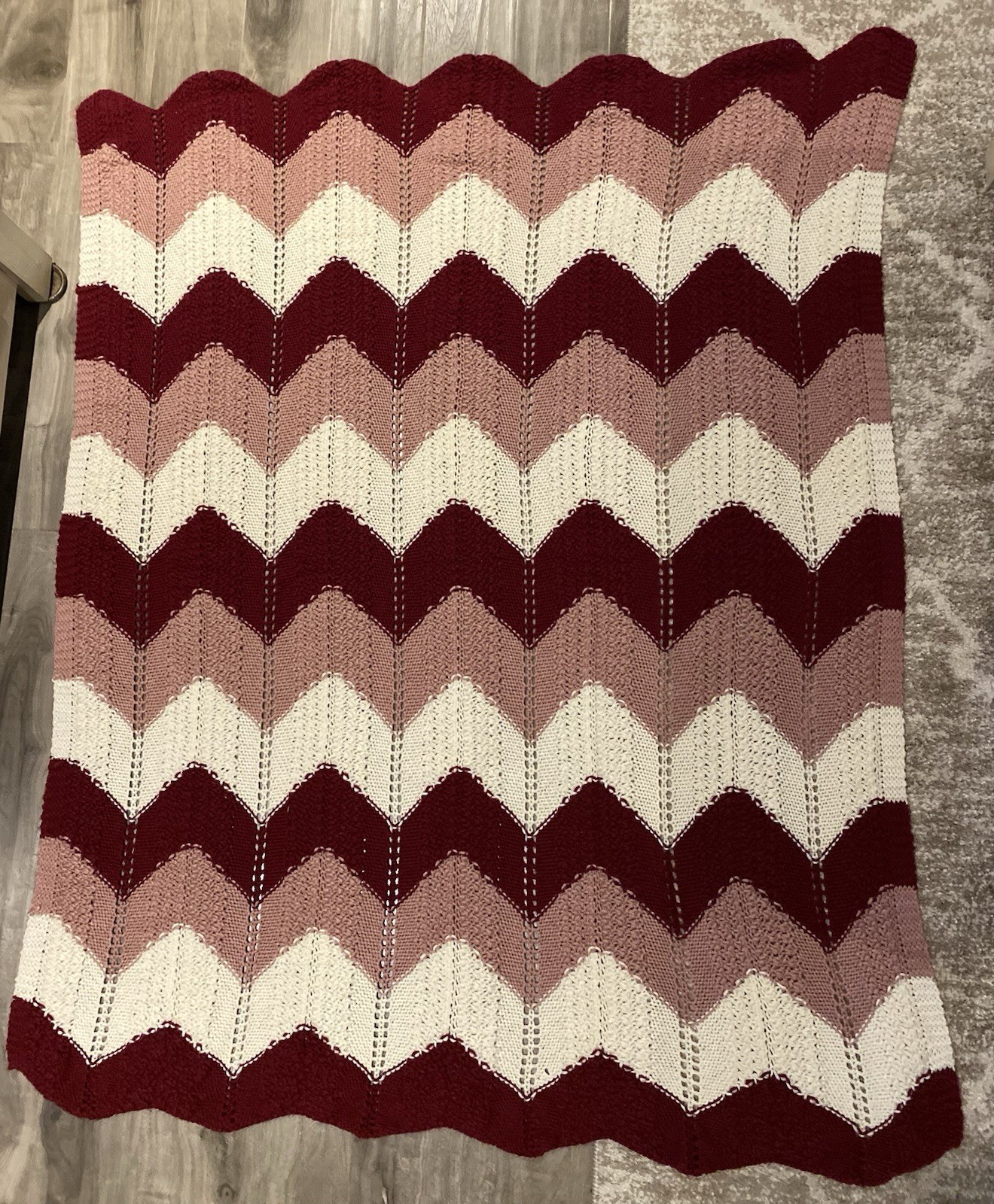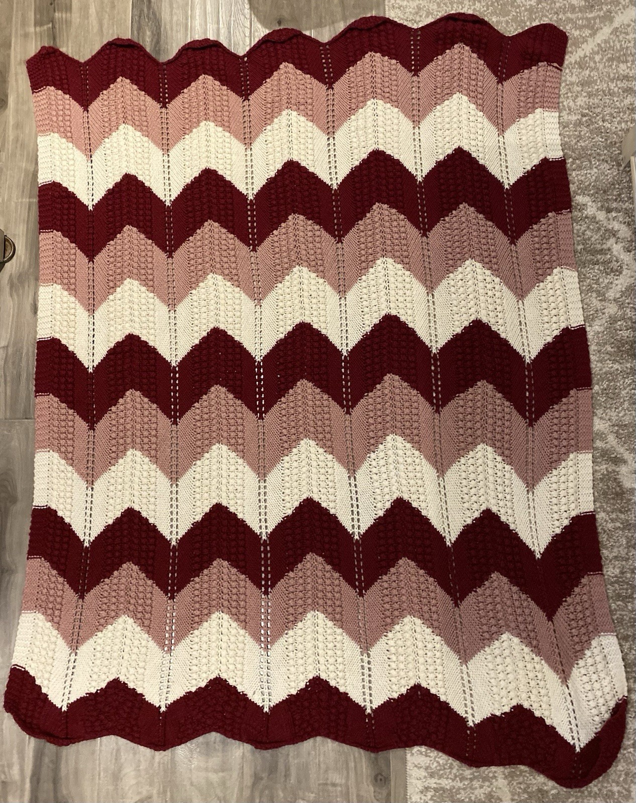Handmade 59”X47” Afghan Crocheted Chevron Zig-Zag Pattern Maroon Mauve And White