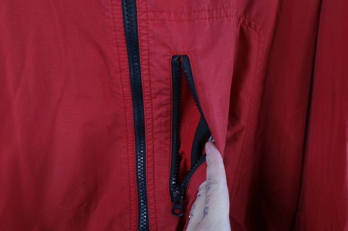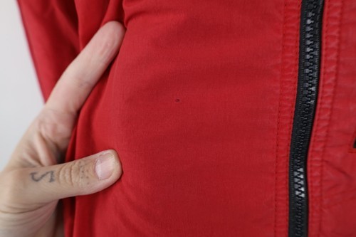 Main zipper pull broken, still zips. Hole/ripped inner collar, piece ripped. Small holes front, inner lining. Blemishes/dark spots throughout. Cuffs stretched/blemished. Inner lining pilled/matted. Collar, cuffs, inner lining discolored. Color faded
