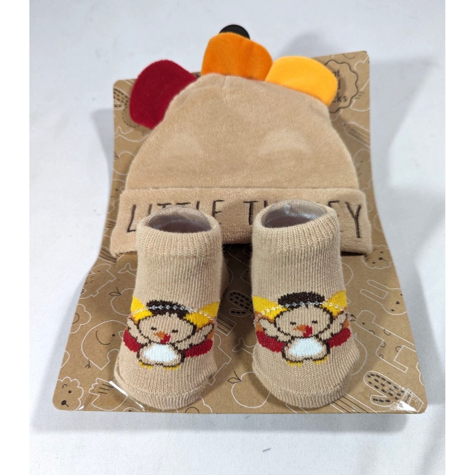 Baby Essentials Little Turkey beanie hat and socks for infant size from 0 to 6 months old.