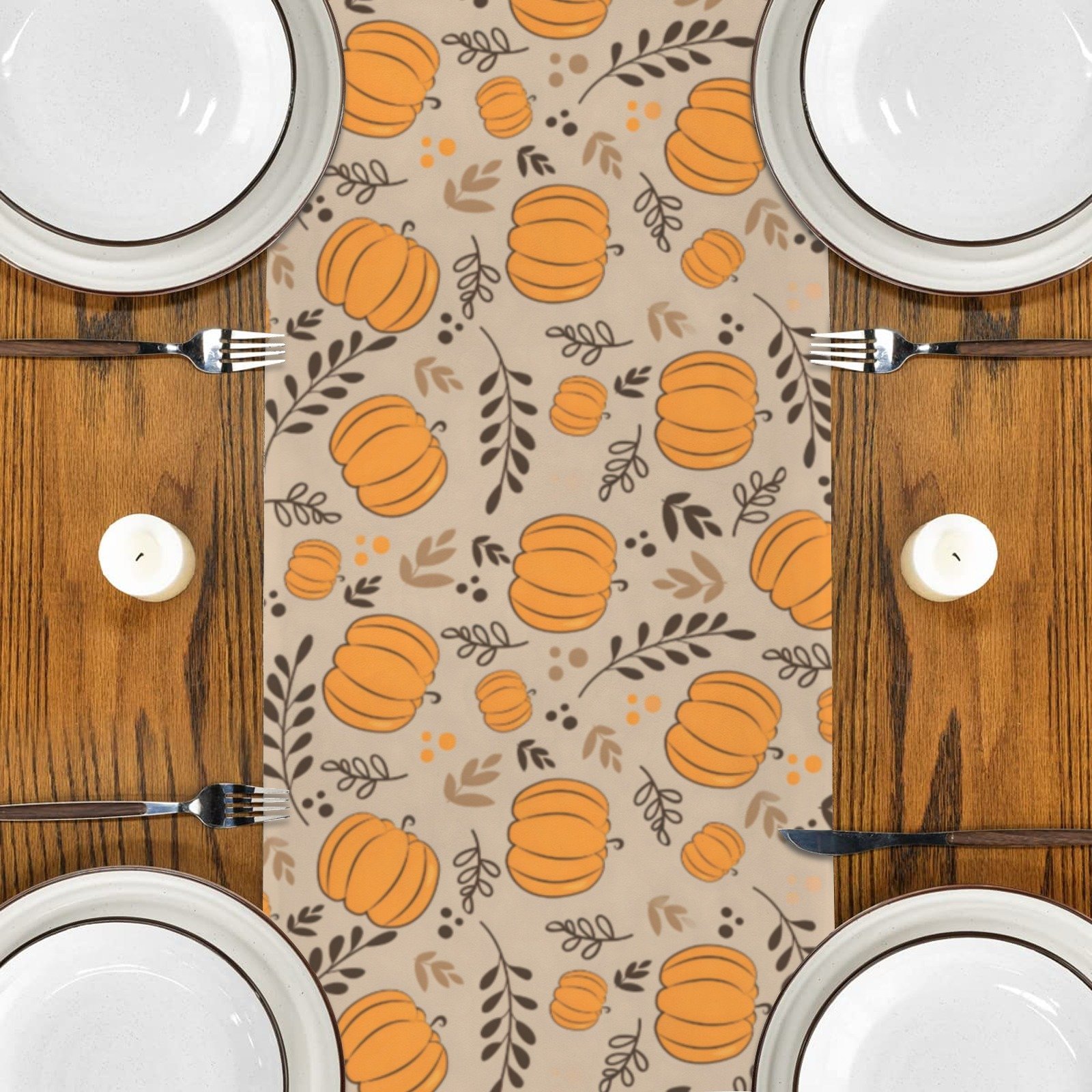 Elevate your holiday gatherings with the Pumpkin Wheat Thanksgiving Table Runner 48" x 13", designed to bring warmth, style, and festive charm to your dining space. Crafted from 100% high-quality polyester, this runner is lightweight yet durable, weighing 6.28 oz., making it the perfect seasonal accessory for any table.