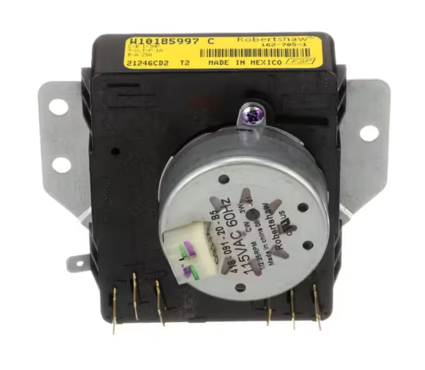 The Whirlpool 162-705-1 / W10185997 Timer is a genuine OEM replacement part for dryers. This cycle timer controls the duration and sequencing of drying cycles, ensuring your appliance runs smoothly and shuts off at the correct time. If your dryer is not advancing through cycles, running too long, or stopping too early, replacing the timer will restore proper performance.