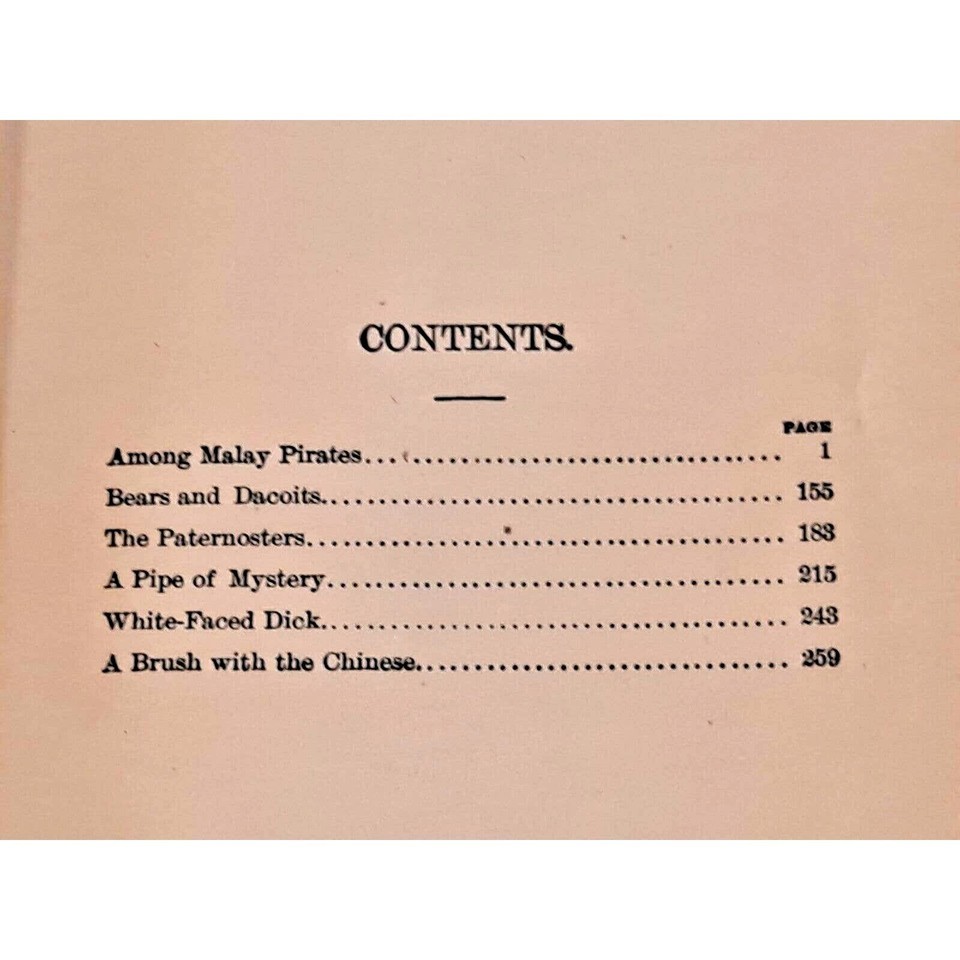 Among Malay Pirates, A Tale of Adventure and Peril by G. A. Henty. This title consists of one novella (the title piece) and five short stories. It was first published in book form by Hurst Co., New York, in 1897. Kennedy Farmer speculate that the stories were probably collected from the 'Boy's Own Annual' and Blackie books - and might have been pirated. This is quite possible, as there are numerous other American editions of this title and pirating of Henty's stories was quite common around the turn of the century. iv + 295 + 26pp ads.