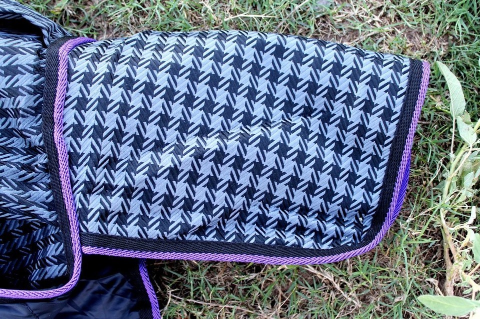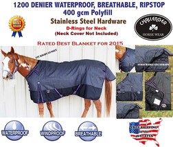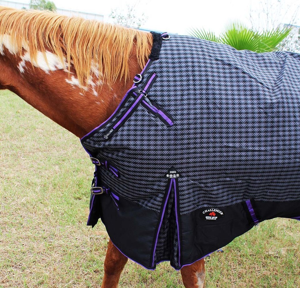 Challenger 1200 Denier turnout heavy-weight winter blanket is constructed with a rip-stop waterproof, windproof, and breathable poly outer shell with 210 lining. 400 grams of poly fill keeps your horse warm and dry in the winter. Blanket features adjustable double buckle front with snap closure, cross surcingles, neck adjust, and elastic leg straps for a secure and snug fit. Tail flap for added protection. Shoulder gussets offers freedom of movement. Fleece wither protection. Nickle plated hardware.