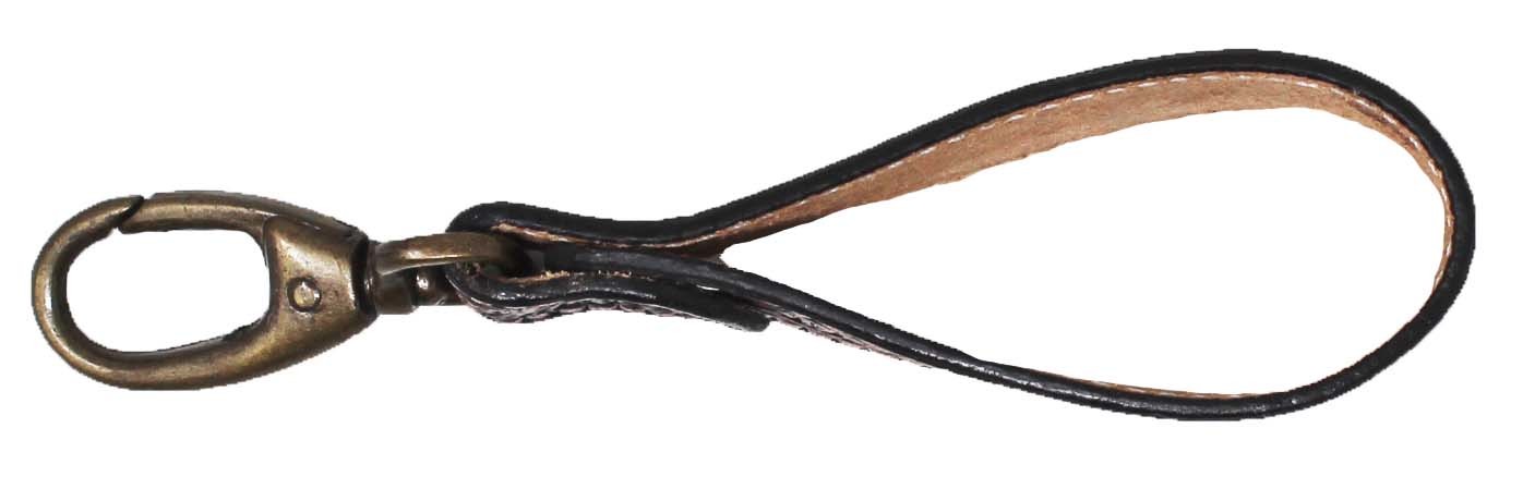 Challenger western 1" wide key fob handcrafted from genuine full grain cow leather. Keychain comes accented with hand-tooled tooling. Features an antique brass swivel snap and measures 4-3/4" long.