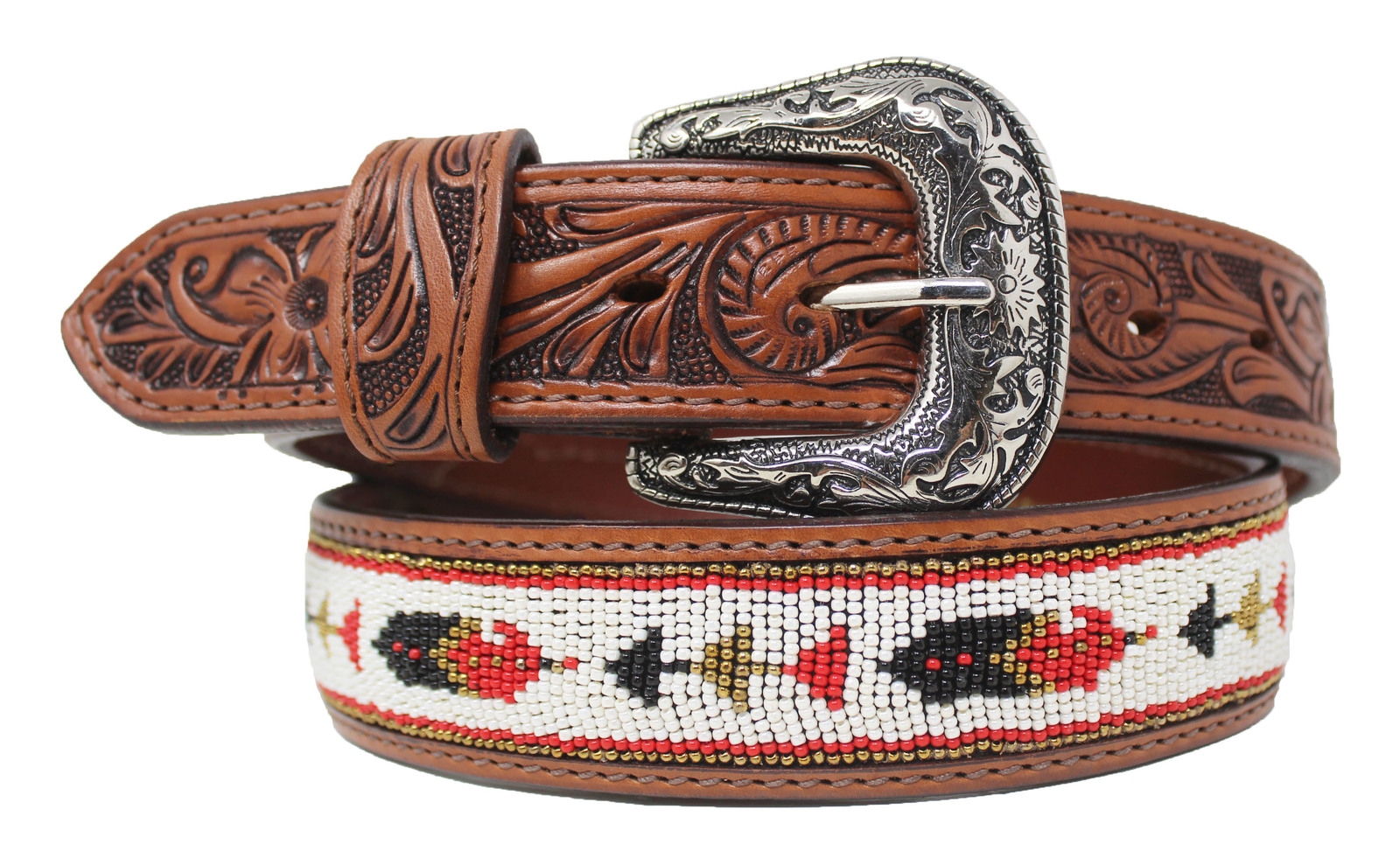 Men Western 1-1/2" Floral Tooled Beaded Full-Grain Tan Leather Belt 26RS75