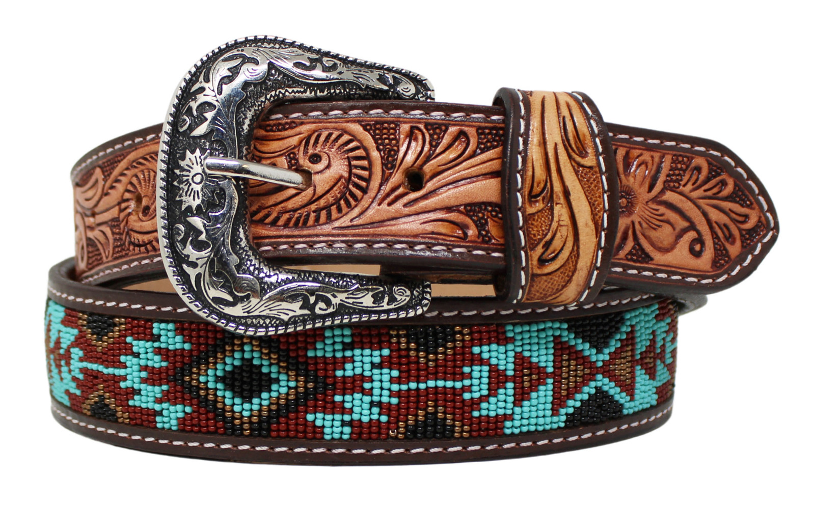 Challenger 1-1/2" wide belt handcrafted from genuine heavy-duty full grain cow leather. Belt features a hand-tooled antique floral design, with a multicolor beaded inlay. Belt comes accented with a changeable silver engraved buckle. The snap button closure end makes changing of buckle quick and easy. We recommend to go up 2" from your waist size for a comfortable fit.