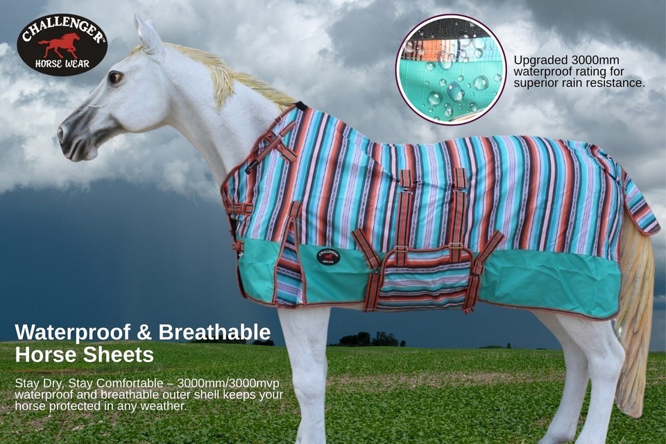 Challenger 1200 Denier turnout horse sheet is constructed with a rip-stop waterproof, windproof, and breathable poly outer shell with 210 lining. The dual front buckle snap closure, cross surcingles, and elastic leg straps help secure blanket in place and ensure a comfortable fit. The reinforced, double-sewn stress points offer additional reinforcement to help prevent tears, while the fleece wither helps provide protection from rubbing. Shoulder gussets allow for freedom of movement. Tail cover provides additional protection from moisture. Hardware made of rust-free stainless steel.
