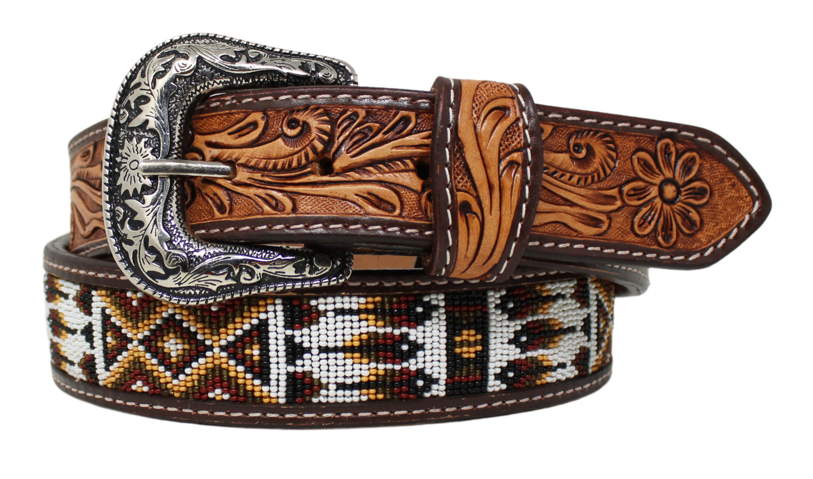 Men Women Western 1-1/2" Wide Floral Tooled Beaded Full-Grain Leather Belt