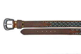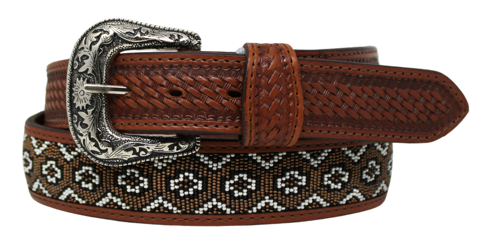 Men Women Western 1-1/2" Basketweave Tooled Beaded Full-Grain Tan Leather Belt