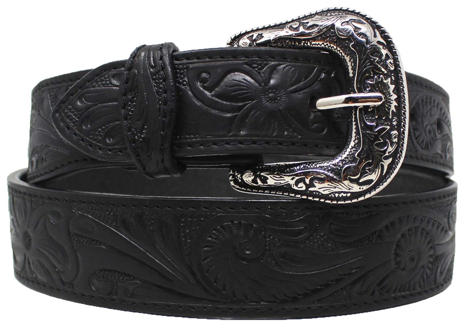 Challenger 1-3/4" wide tapered belt handcrafted from genuine heavy-duty full grain cow leather. Belt features a hand-tooled floral design on black leather. Belt comes accented with changeable silver engraved buckle. The snap button closure end makes changing of buckle quick and easy. We recommend to go up 2" from your waist size for a comfortable fit.
