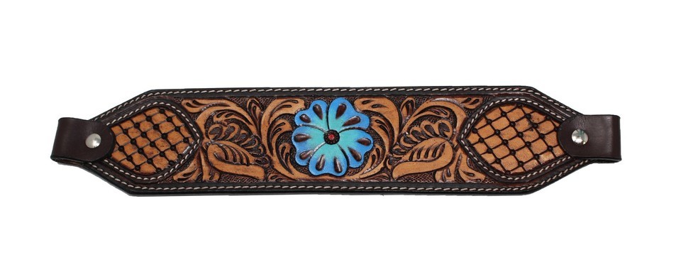 Challenger full grain leather bronc nose halter features a unique hand carved, painted, and tooled design. The nylon web halter is fully adjustable to ensure a great fit. Halter includes matching lead rope. Rust-free stainless steel hardware.