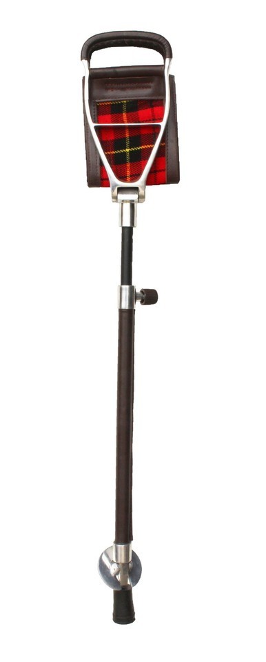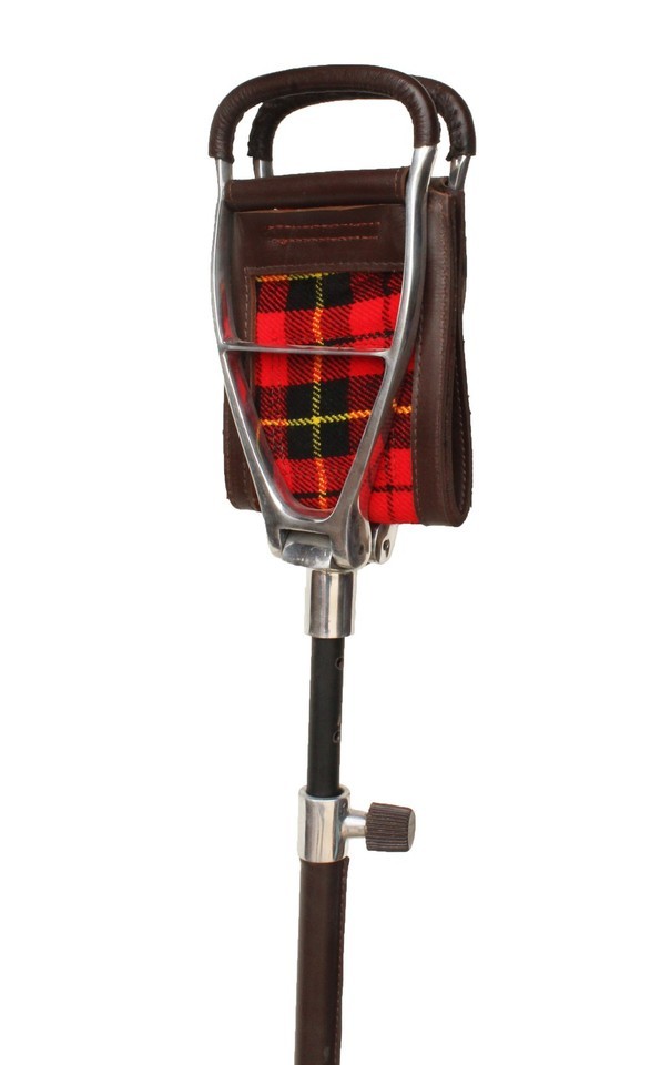 Compact and lightweight golf spectator folding seat stick simply unfolds at the handle to create a 10-1/2" padded leather sling seat. Shaft is made of heavy-duty made to last chromium steel and wrapped in leather. Adjustable from 19" to 32" for sitting and walking comfort. Uniquely accented with a red plaid inlay.